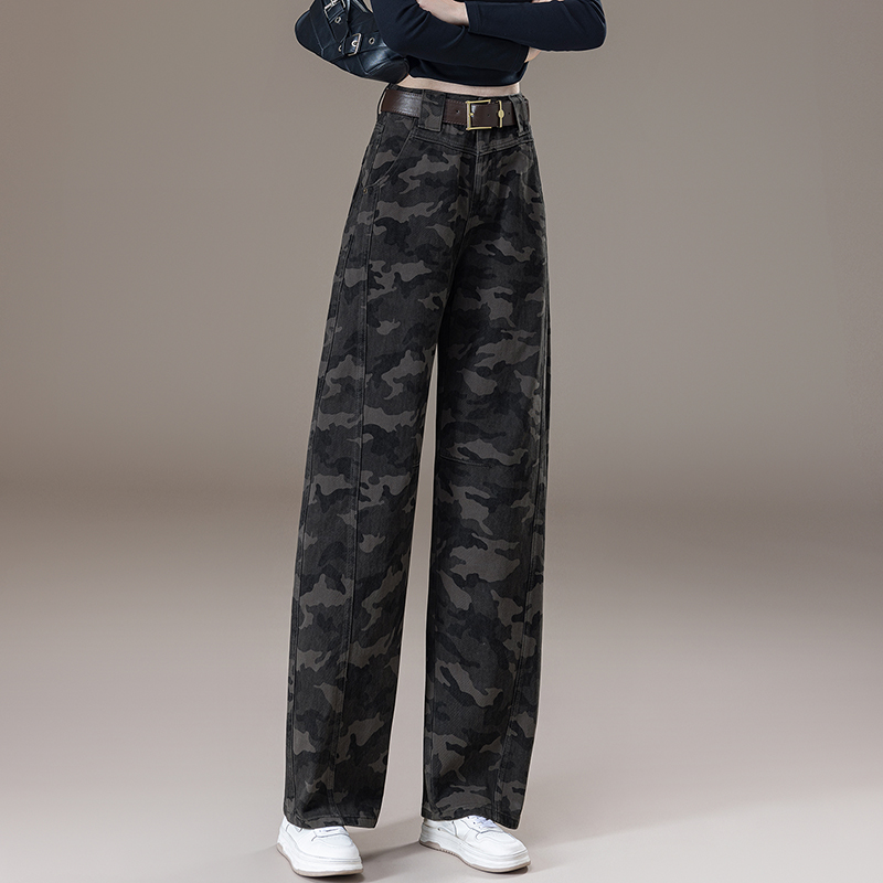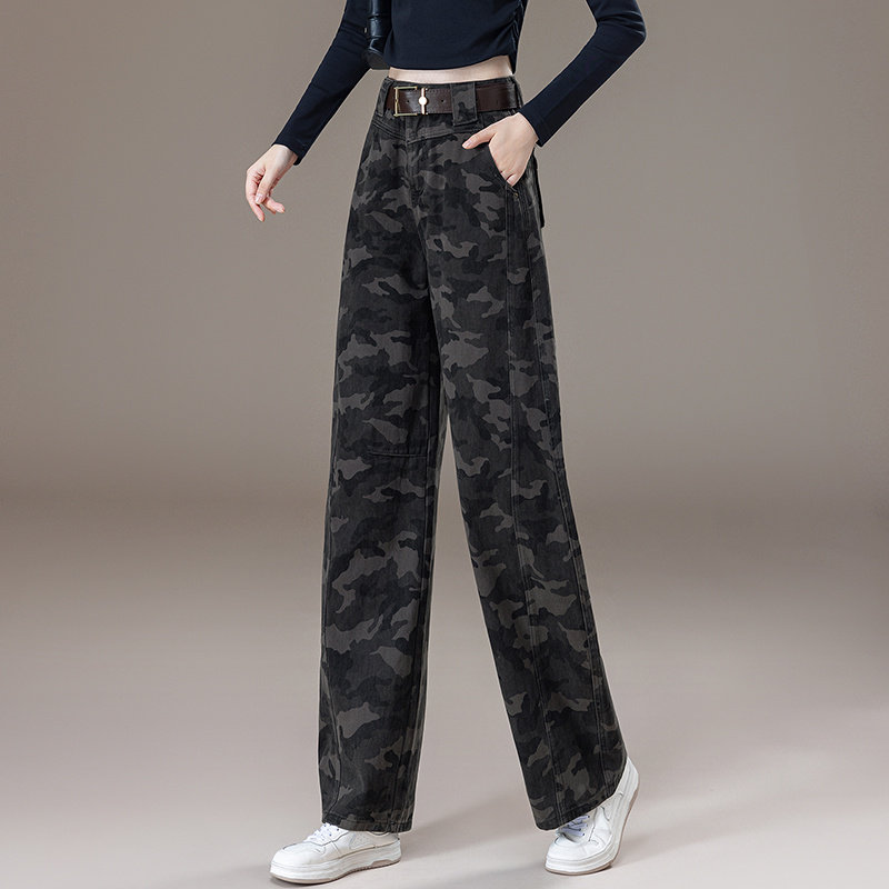 啄木鸟品牌美式迷彩风牛仔弯刀裤2025秋冬高腰宽松显瘦新款阔腿裤