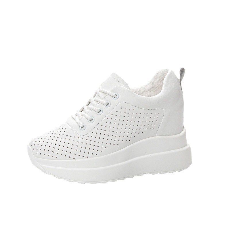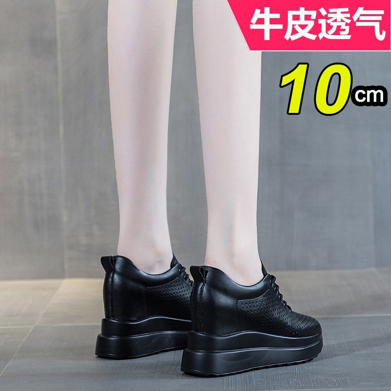 10cm坡跟鞋女2024新款内增高小白鞋夏单鞋镂空透气真皮一脚蹬女鞋
