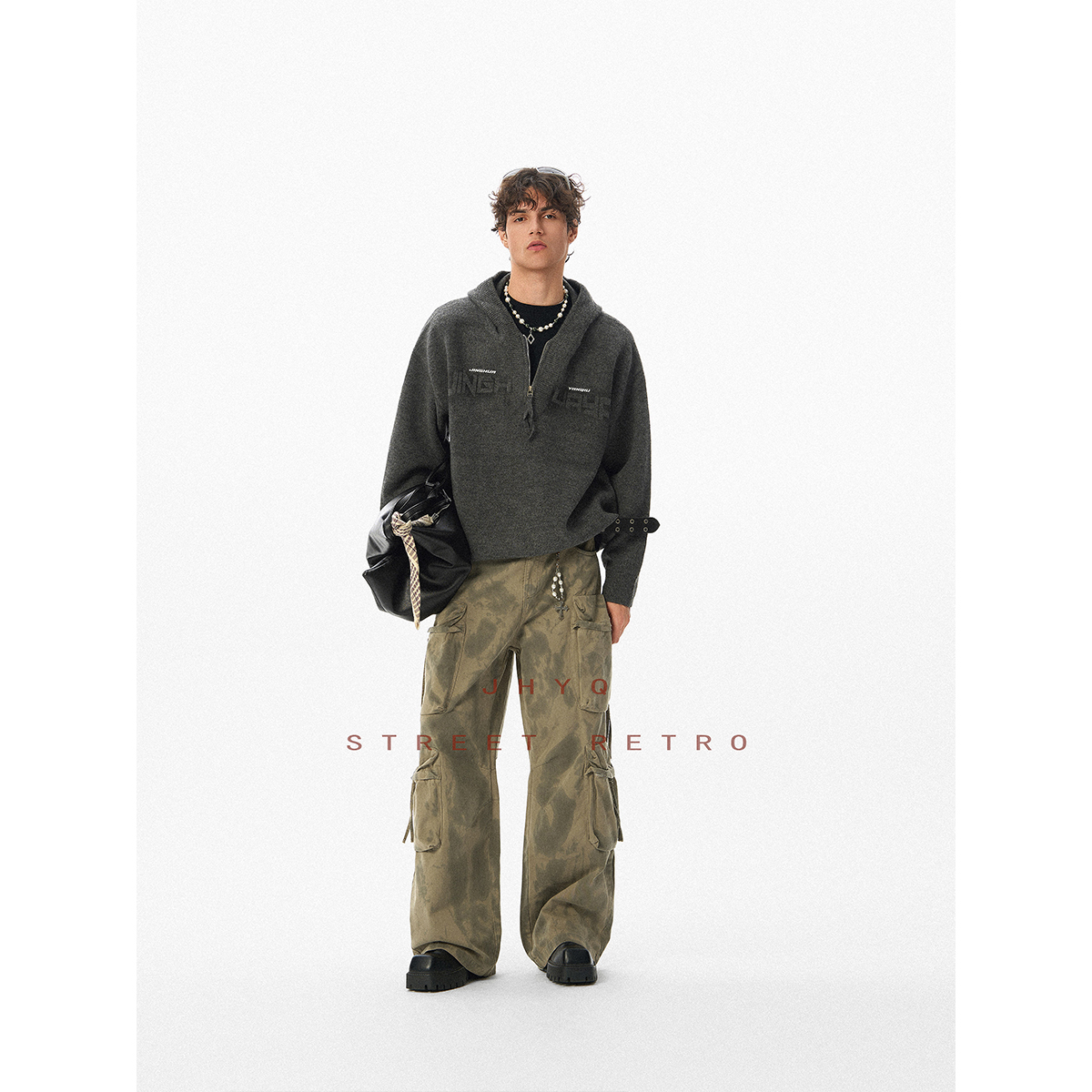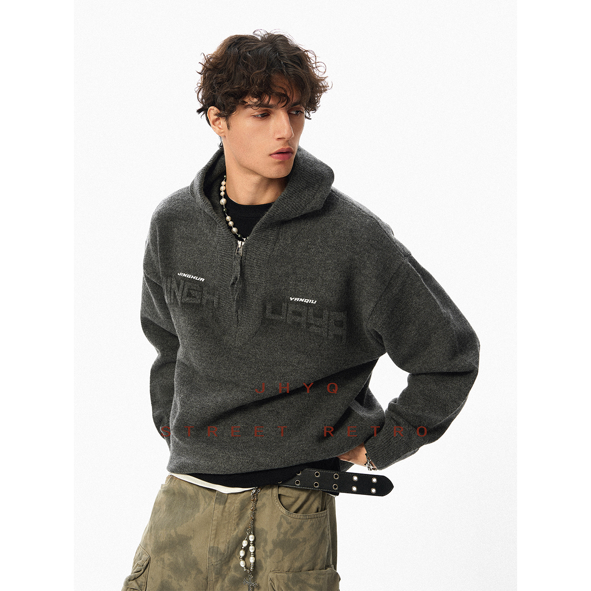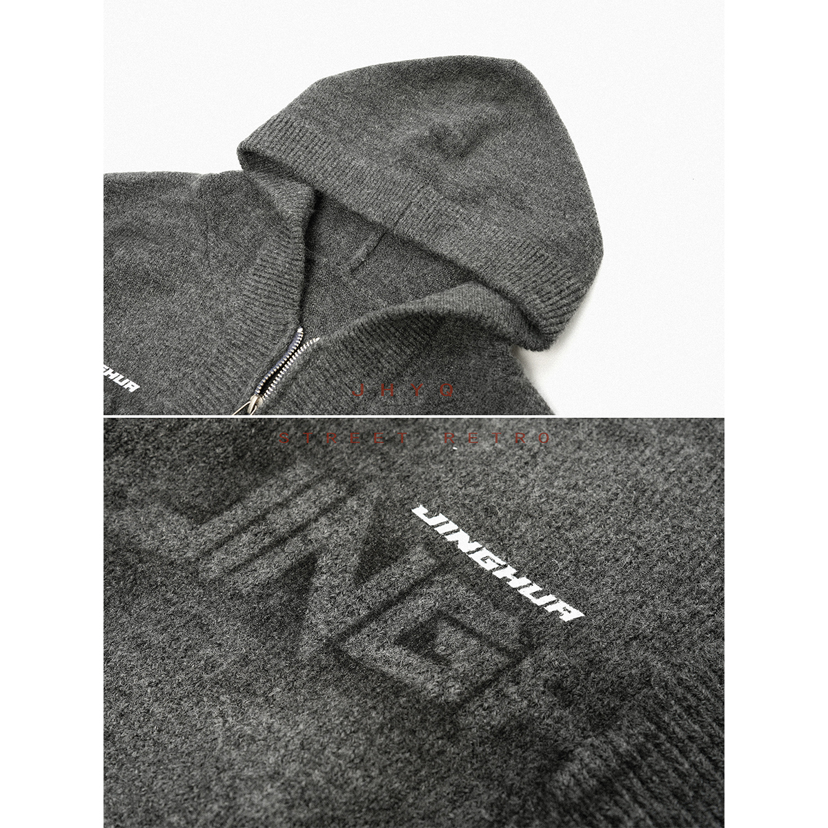 JHYQ秋冬重磅连帽印花半拉链领毛衣衫男美式休闲宽松卫衣外套