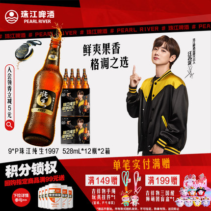 珠江啤酒1997纯生528mL*12瓶*2整箱批发玻璃瓶生啤酒官方旗舰店