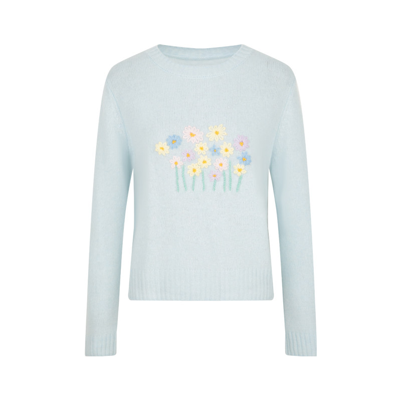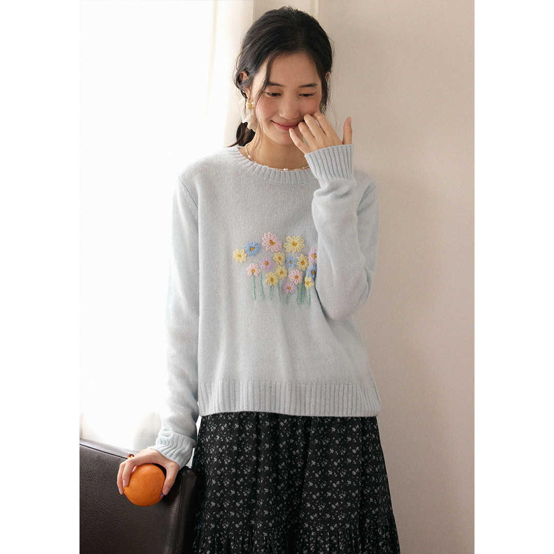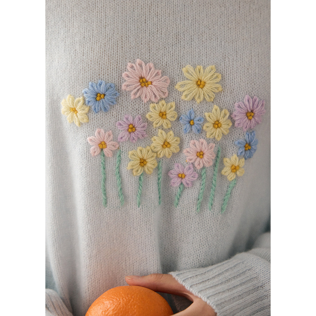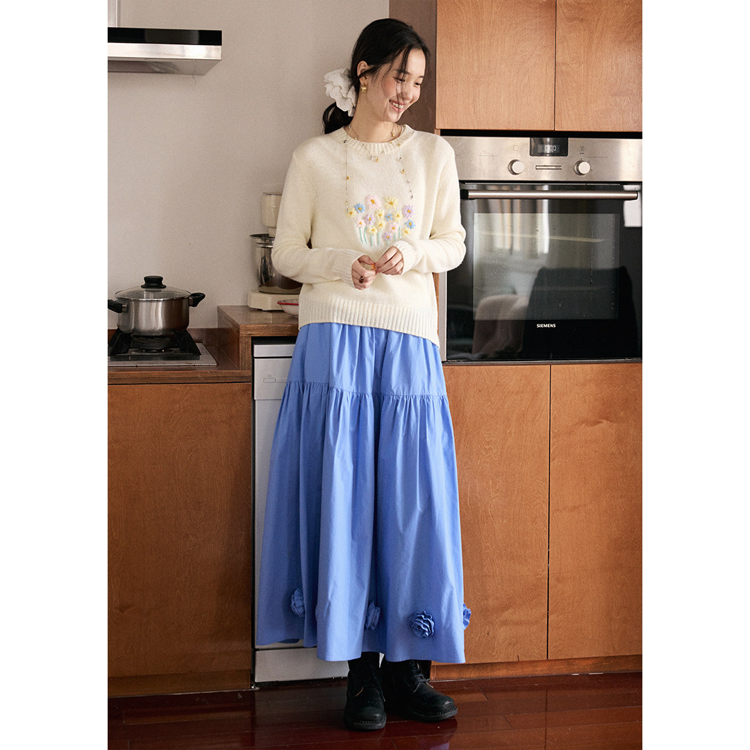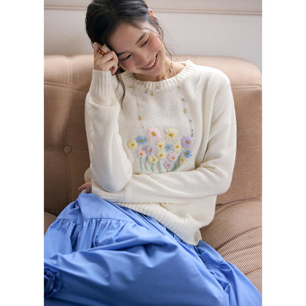 BLUEerror 立体手工花朵圆领白色套头毛衣女全羊毛慵懒针织衫秋冬