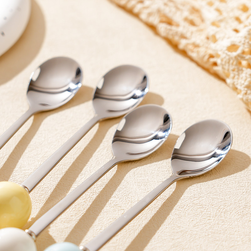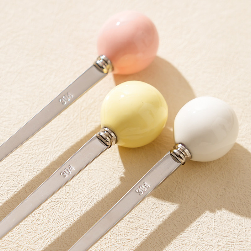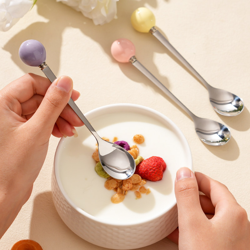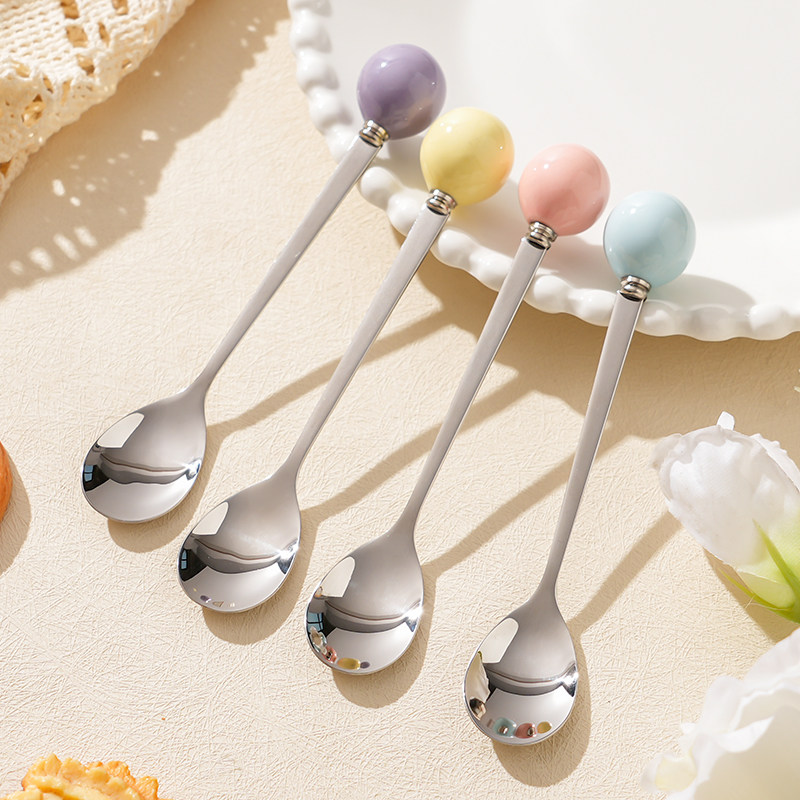 304不锈钢食品级勺子高颜值精致甜品冰淇淋勺陶瓷圆珠咖啡搅拌勺