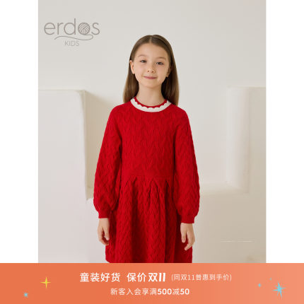 鄂尔多斯童装儿童针织连衣裙2025年秋冬新品圆领长袖新年连衣裙