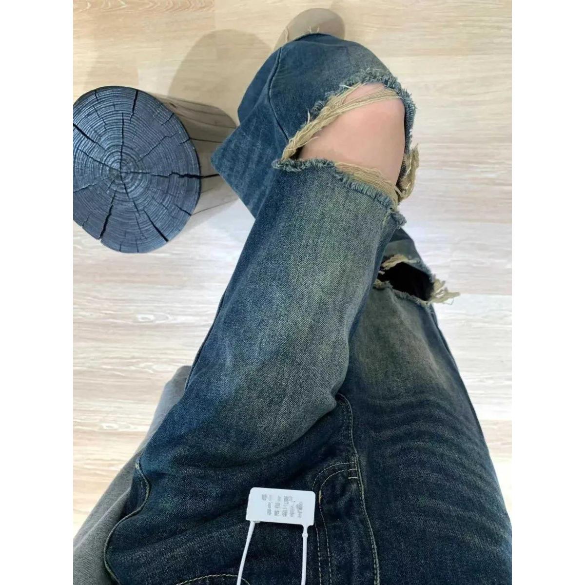 美式复古破洞毛边直筒牛仔裤夏季新款高腰宽松设计阔腿拖地裤子
