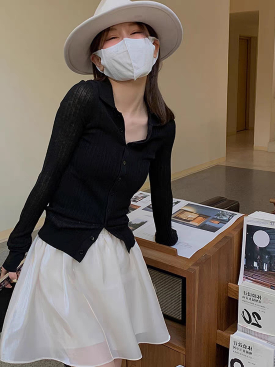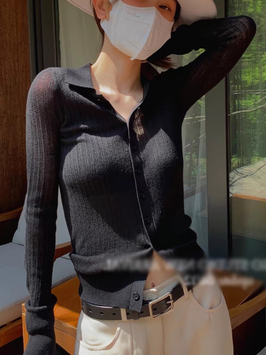 微透开衫女V领超薄羊毛针织衫翻领包身长袖小众天丝短款防晒衣夏