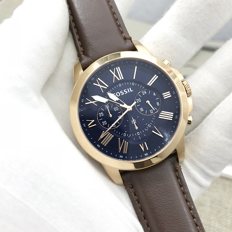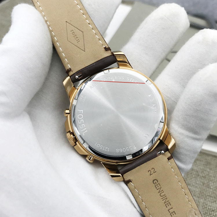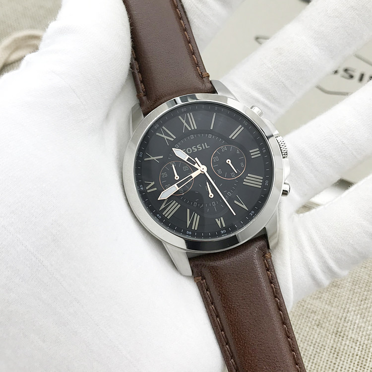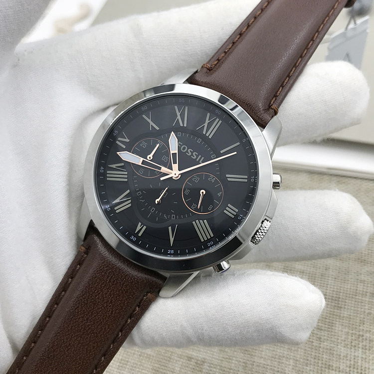 FOSSIL手表真皮表带啡色玫瑰金三眼计时石英表商务休闲防水男表