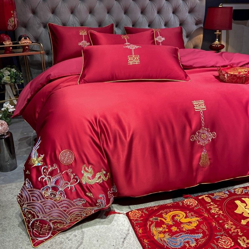 奢华喜字刺绣四件套大红色全棉E床单被套中式结婚床上用