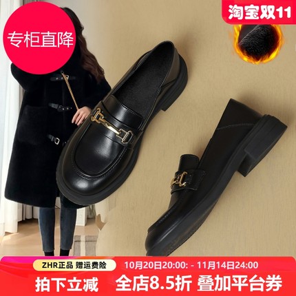 ZHR加绒乐福鞋女款2025冬季新款软底英伦风小皮鞋黑色复古女鞋子