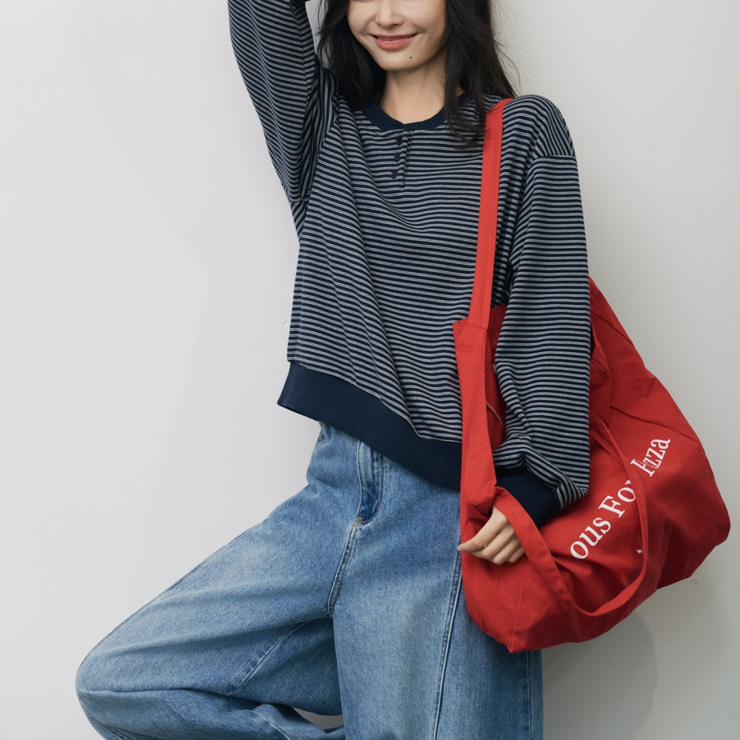 韩版宽松圆领套头撞色条纹卫衣