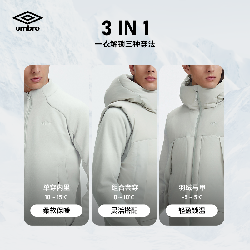 umbro茵宝运动羽绒服鸭绒冬季男款保暖马甲摇粒绒内里三合一外套