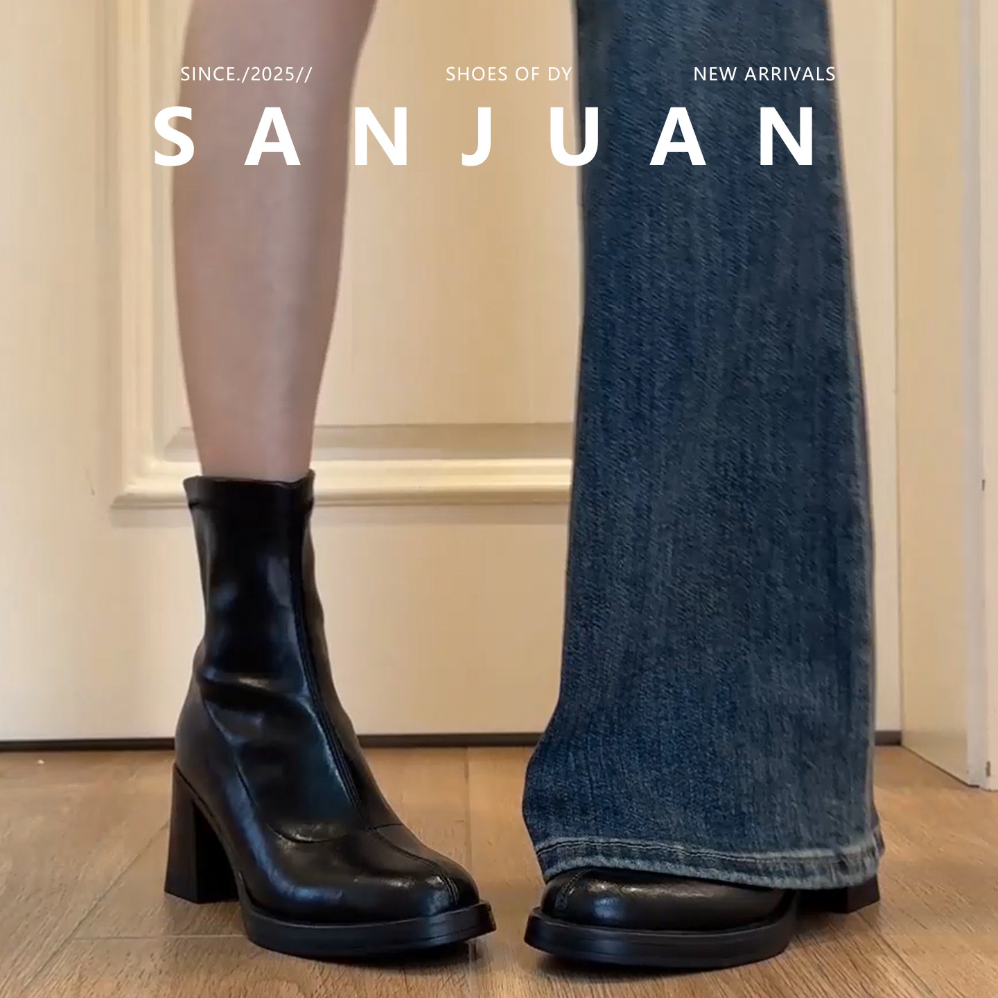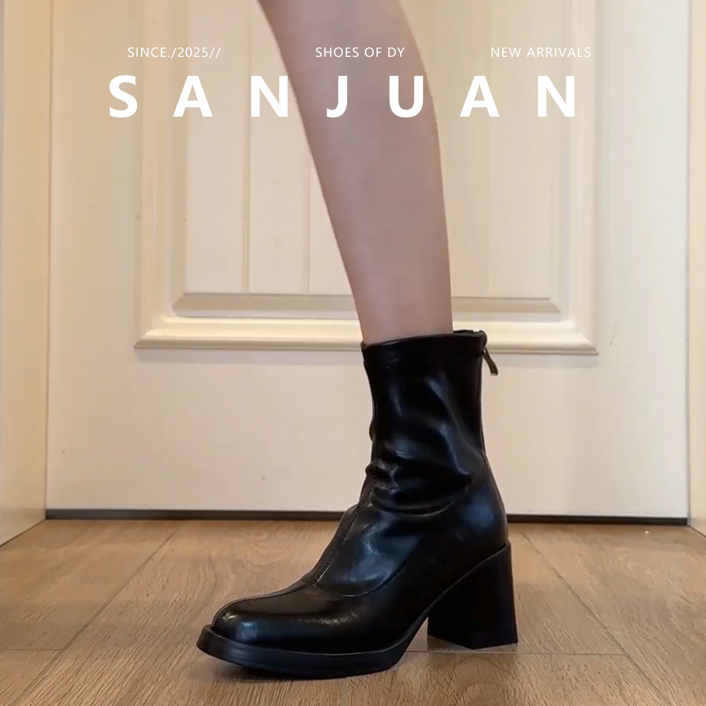 羊皮版sanjuan三卷短靴粗跟高跟显瘦弹力靴瘦瘦靴小个子马丁靴女