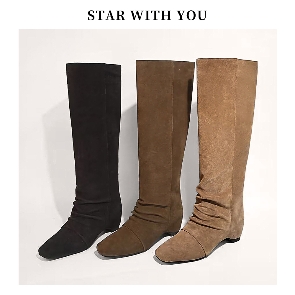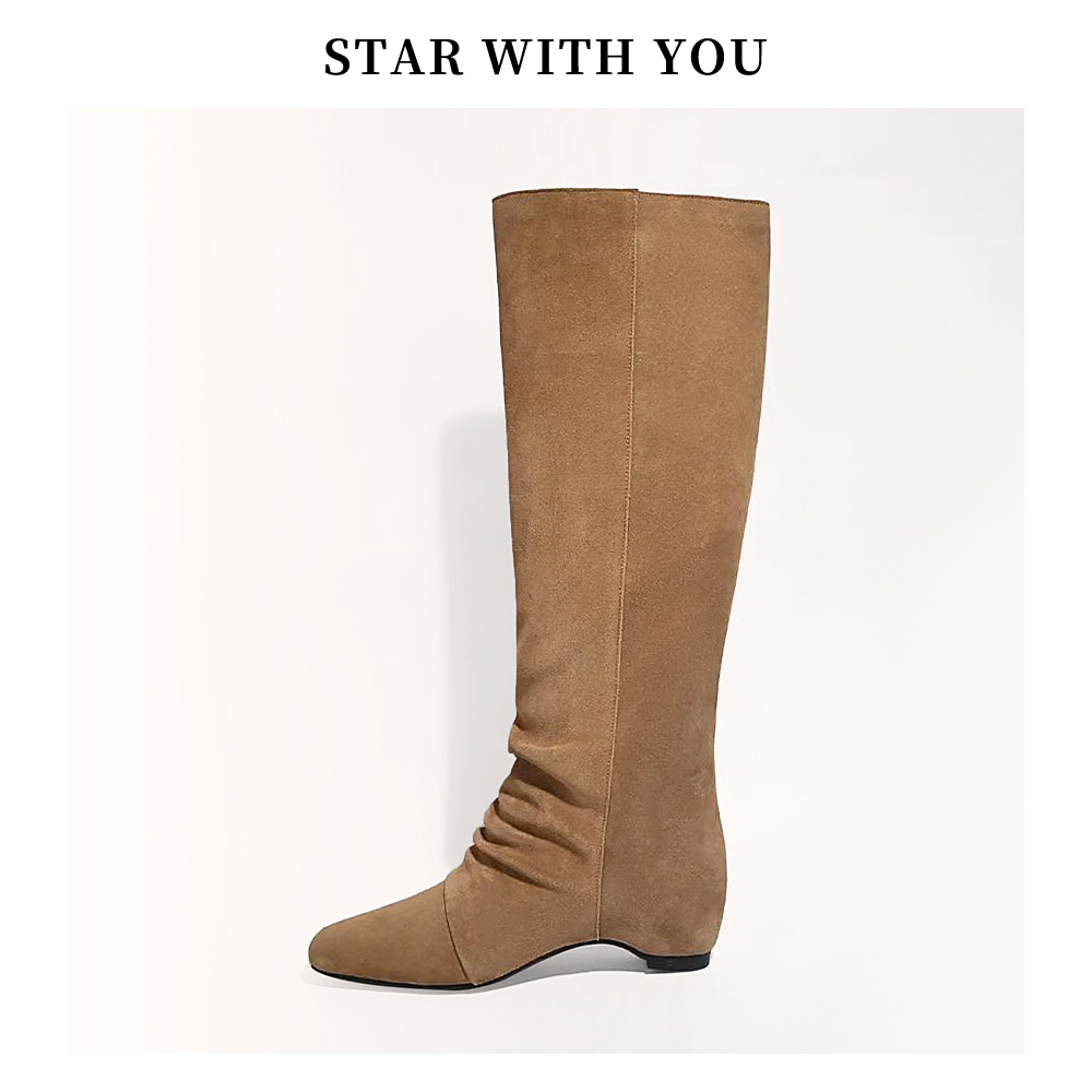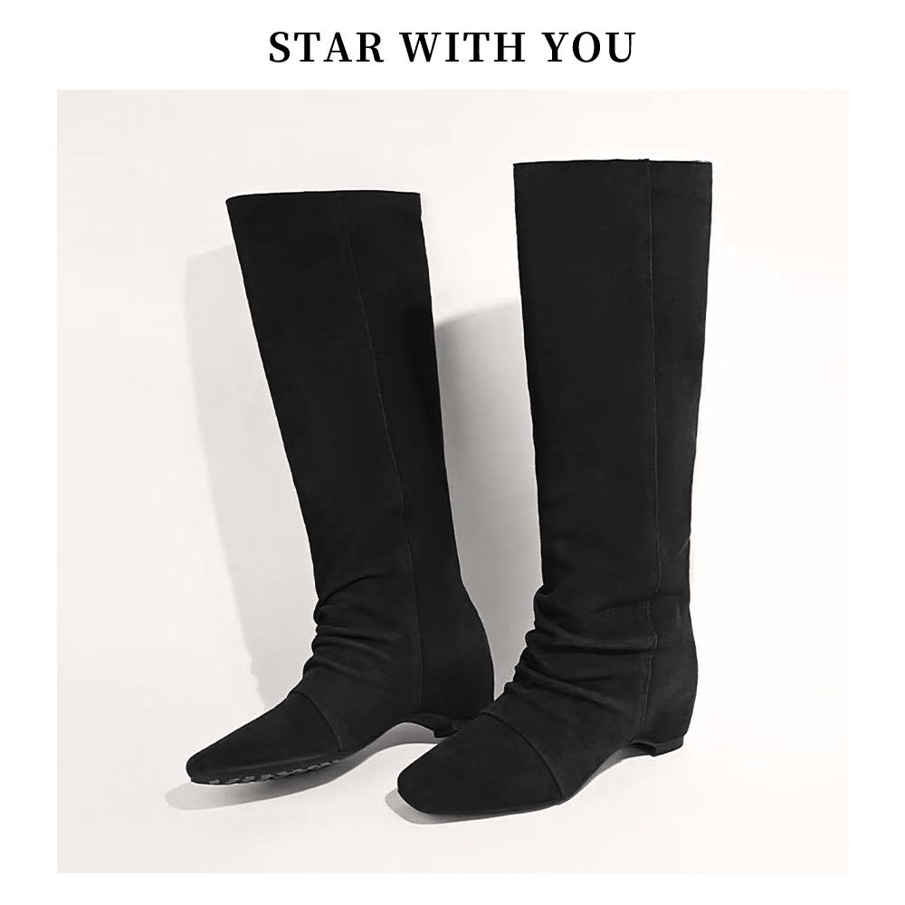 【STAR】极简风内增高百搭显瘦褶皱复古方头麂皮堆堆靴5cm