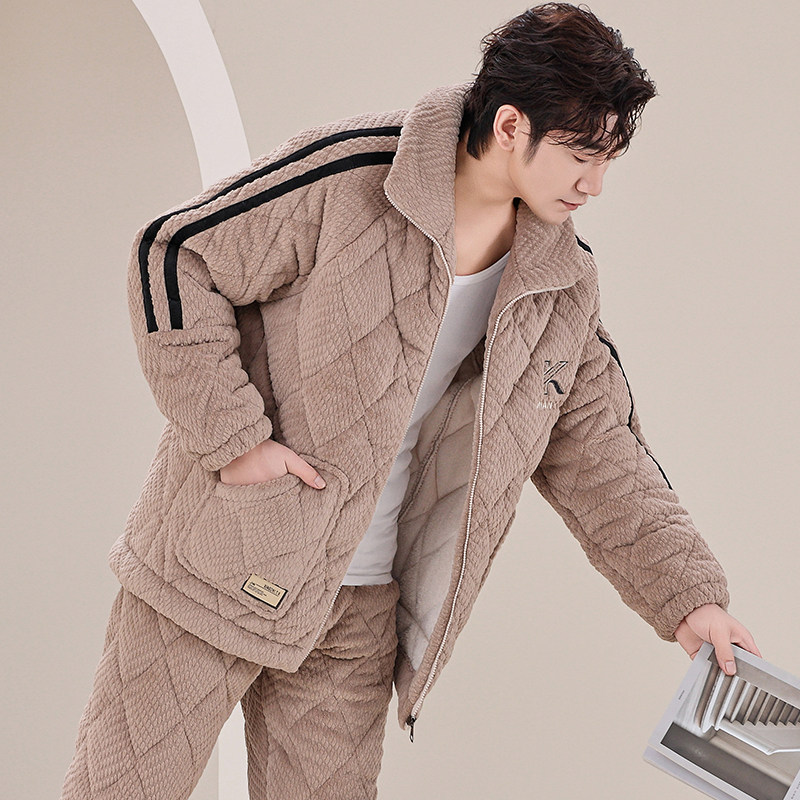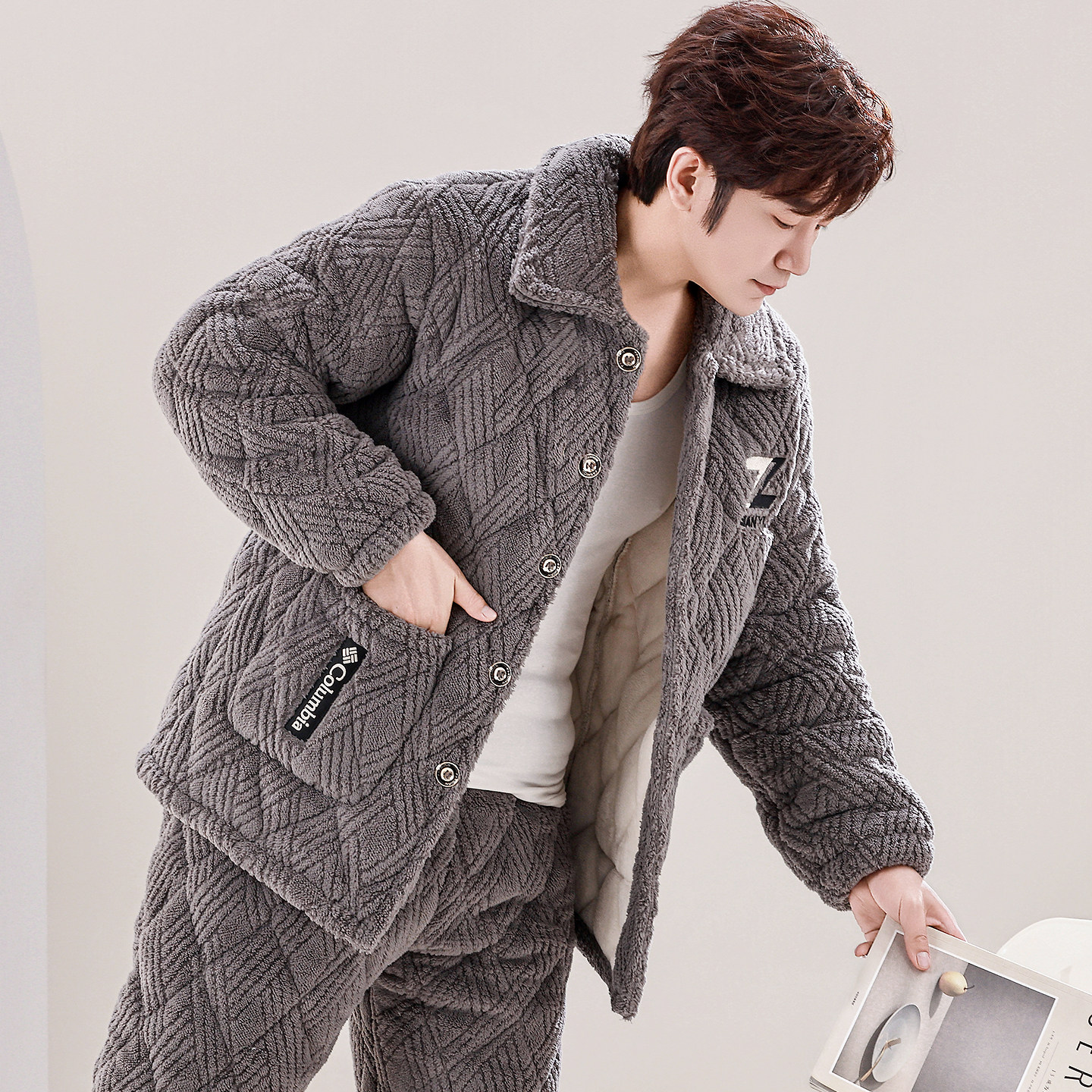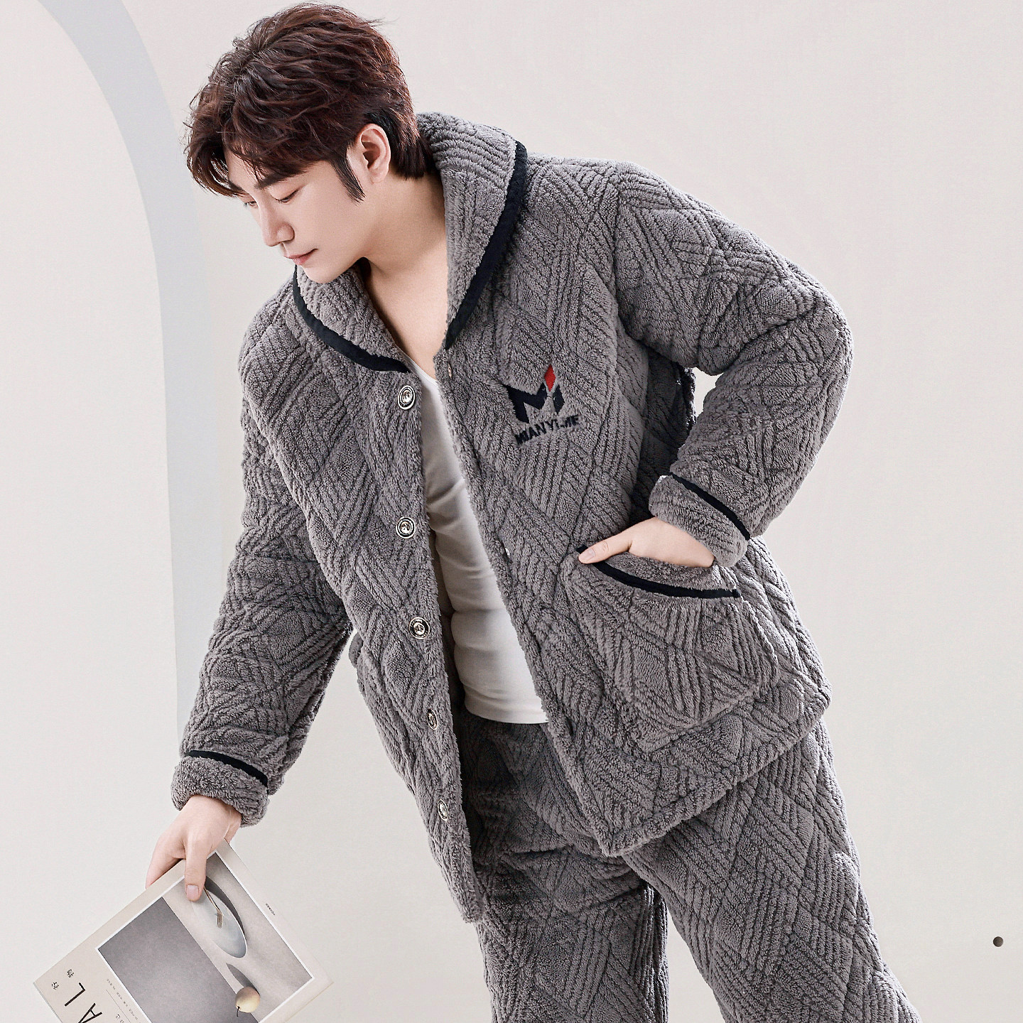 棉依界冬季男士睡衣珊瑚绒三层夹棉加厚加绒家居服保暖套装秋冬款
