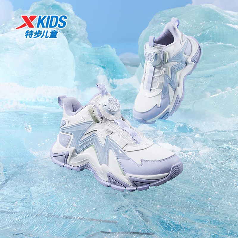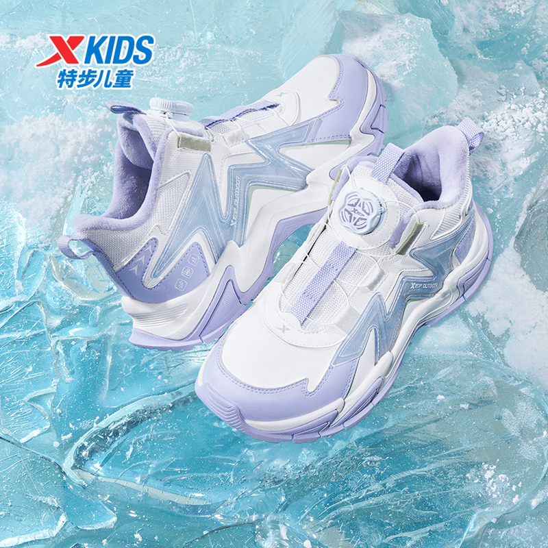 特步童鞋冬季女童中大童运动休闲中帮旋转扣加绒内里防滑耐磨棉鞋