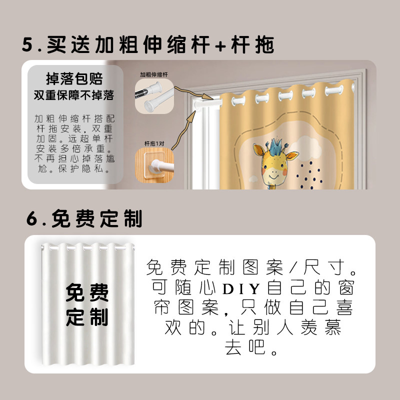 全遮光儿童房小窗户窗帘遮光2025新款免打孔安装女孩卧室飘窗隔热