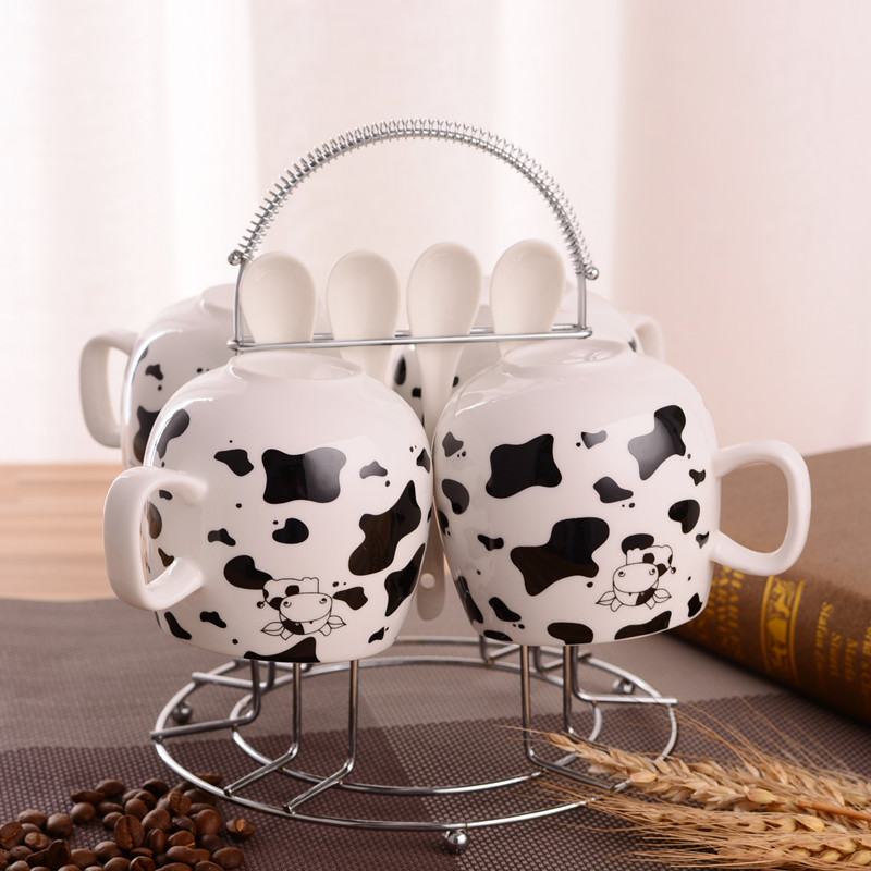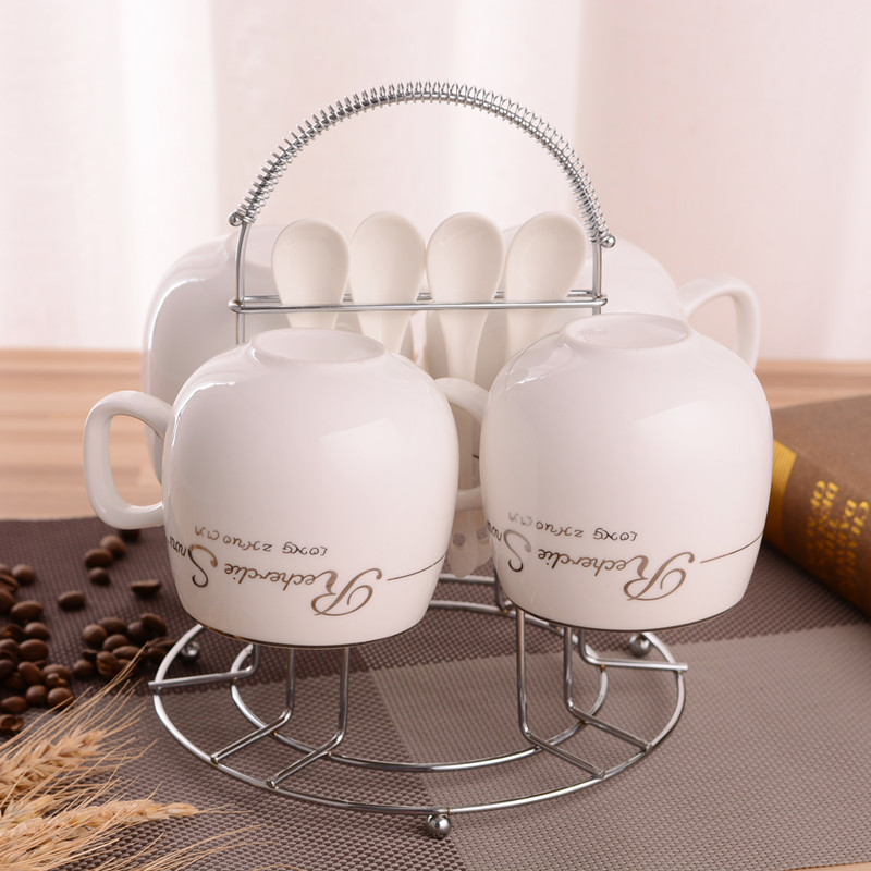 陶瓷马克杯 金边骨瓷咖啡杯套装4个送架创意牛奶杯可爱早餐杯水杯