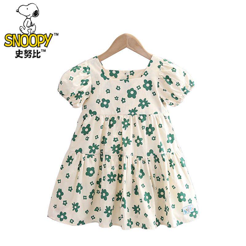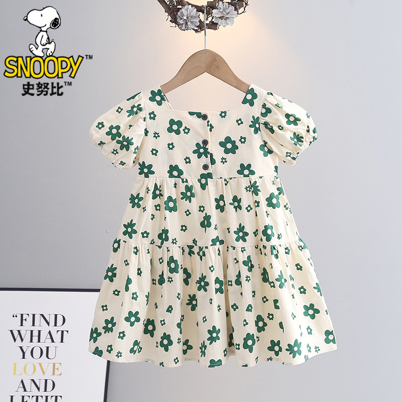 史努比女童碎花连衣裙方领泡泡袖夏装绿色小清新2025童装新款网红