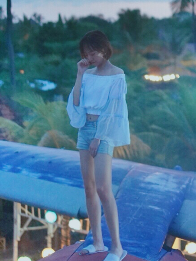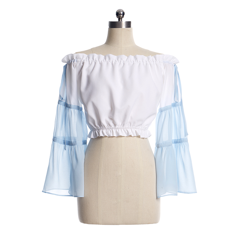 夏季休闲沙滩度假上衣一字领白雪纺长水袖高腰露脐露肩潮流超仙女