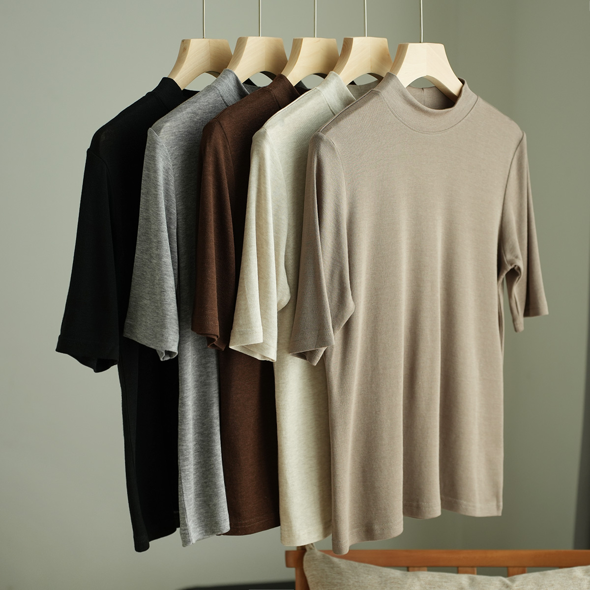 87256 莱赛尔羊毛 薄 女士半高领针织T恤 赫本风中袖打底衫早秋款