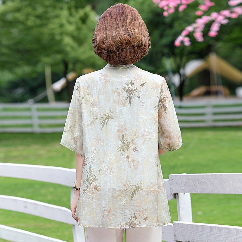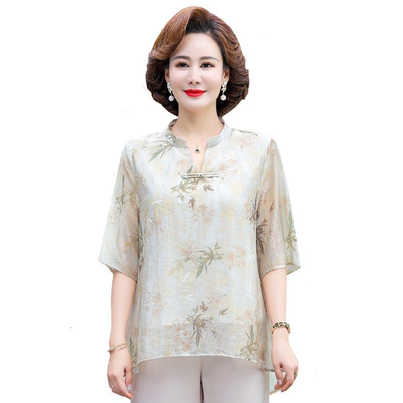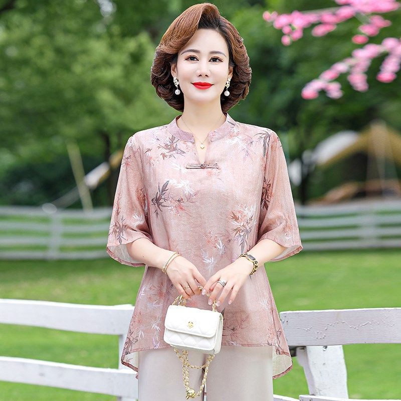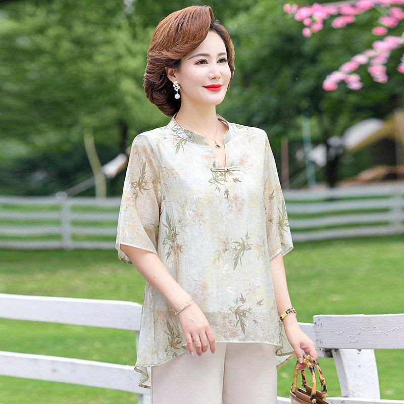 妈妈夏装短袖套装女中老年人雪纺T恤衫洋气奶奶新款夏季气质国风