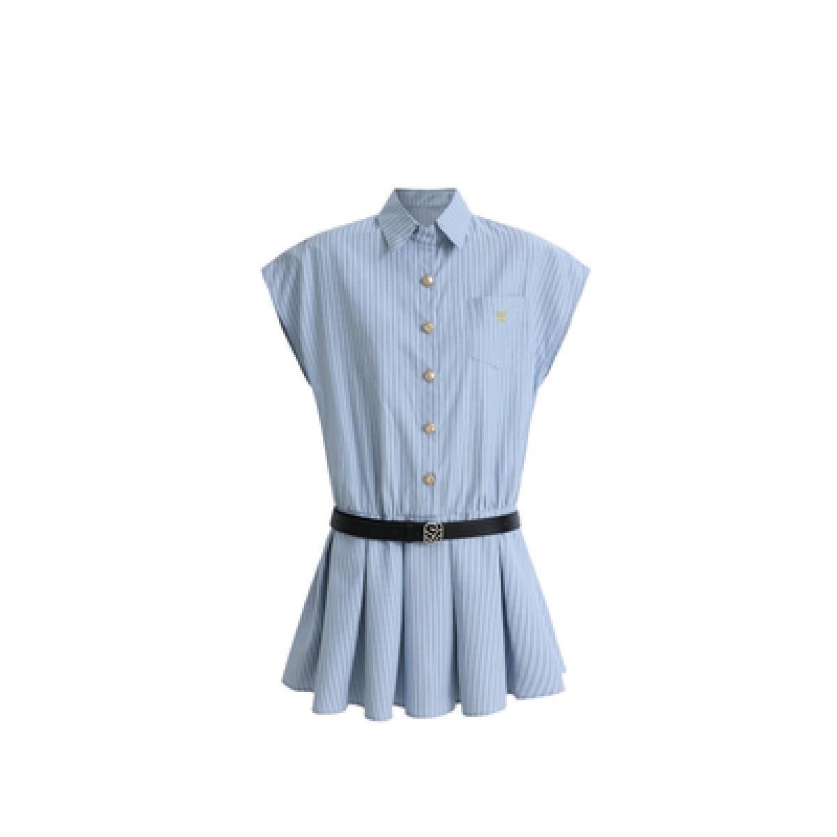 学院风蓝色条纹衬衫连衣裙子女收腰显瘦气质设计感小众百褶短裙夏