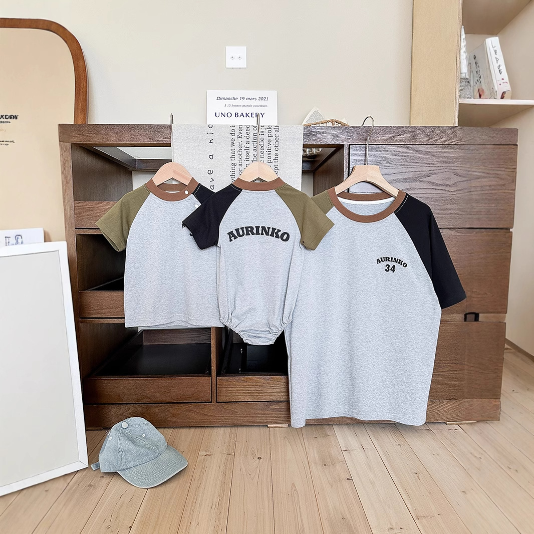 美式亲子装2025夏季新款撞色短袖T恤一家三口父子装婴儿爬服上衣