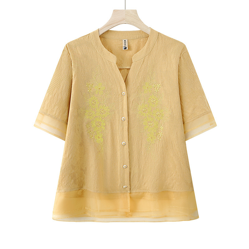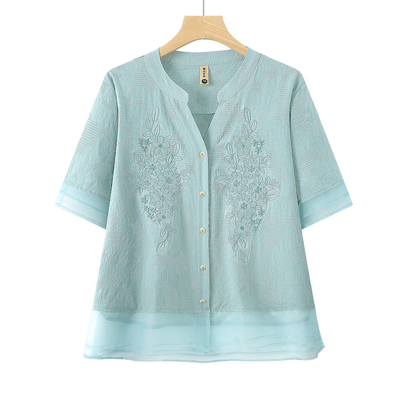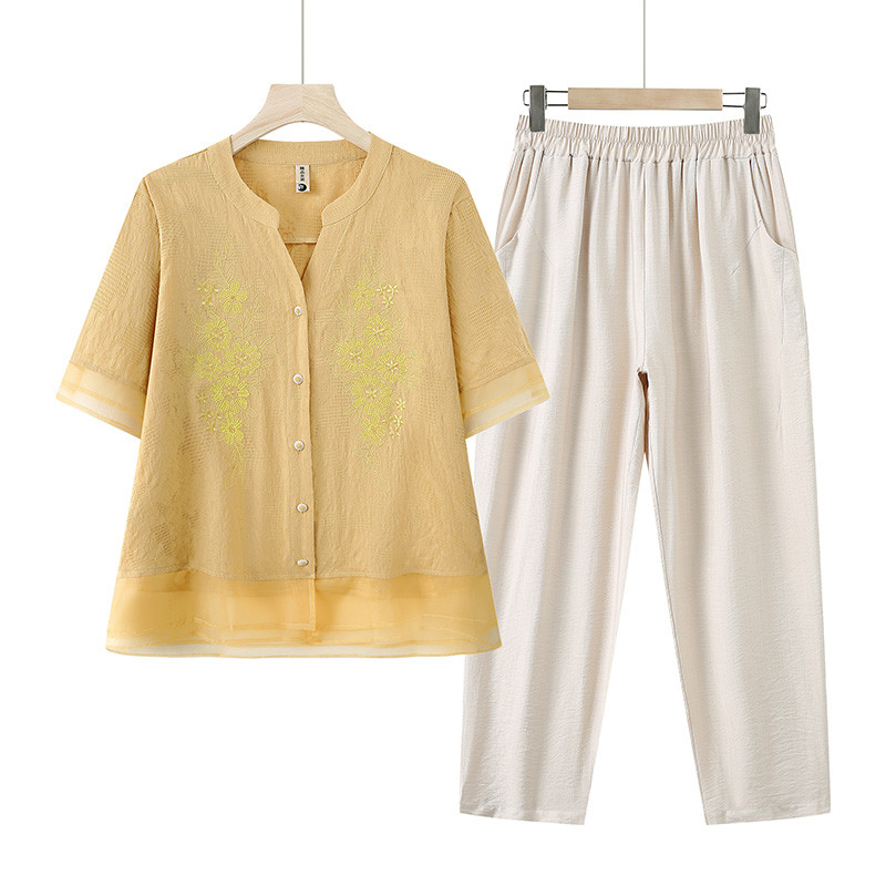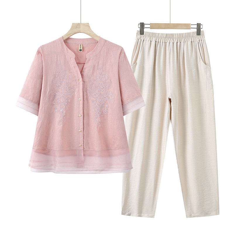 妈妈夏装纯棉麻短袖衬衫T恤套装中老年女夏季薄款两件套宽松上衣