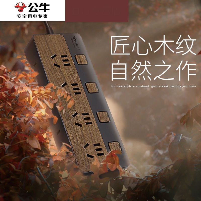 公牛木纹快充插排办公家用插线板