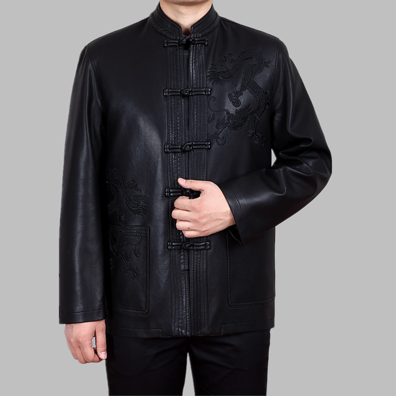海宁真皮皮衣男中老年爸爸唐装绵羊皮外套盘扣刺绣中国风皮夹克