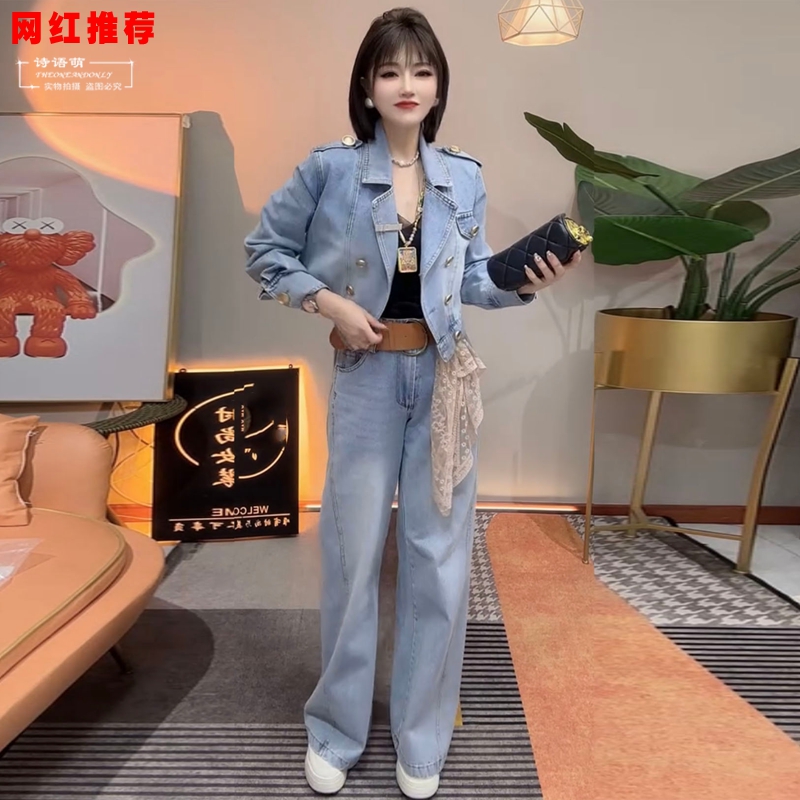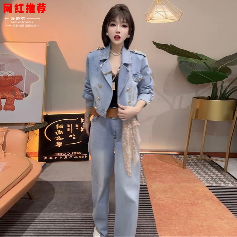 网红2025新款欧洲站时尚气质修身显瘦套装牛仔外套+裤子两件套女