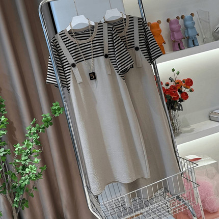 大码条纹假两件短袖背带裙女夏季