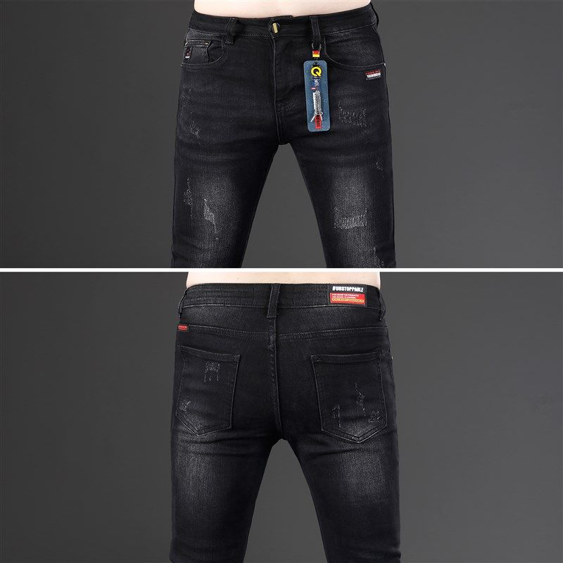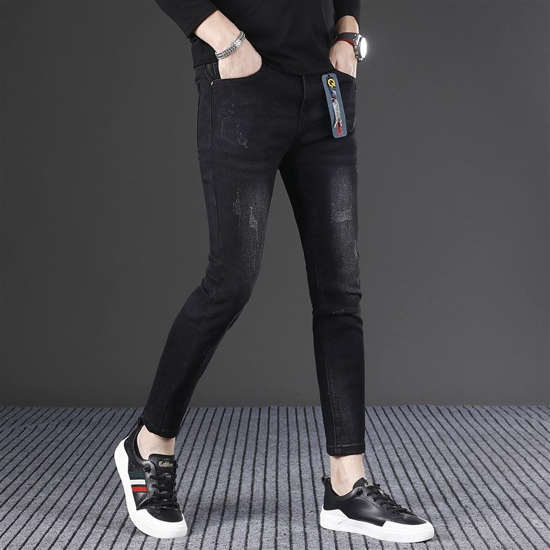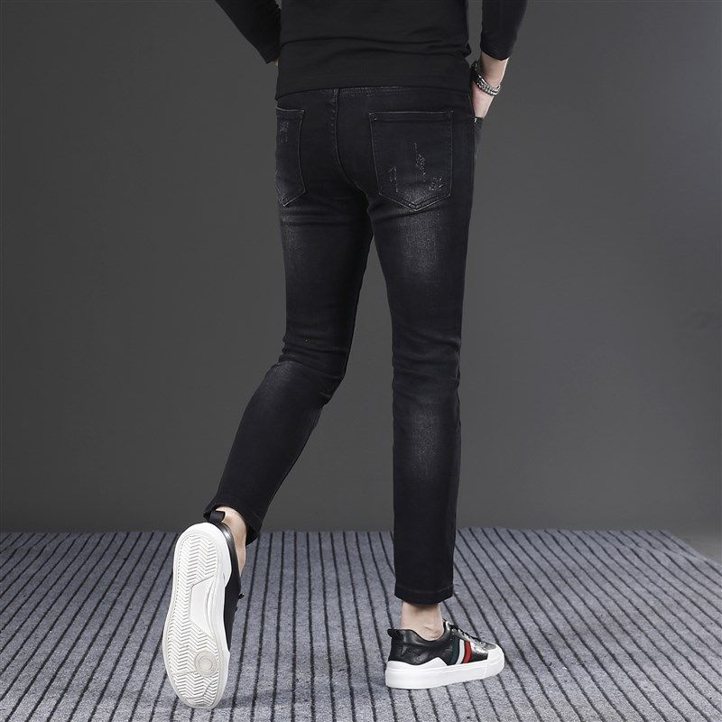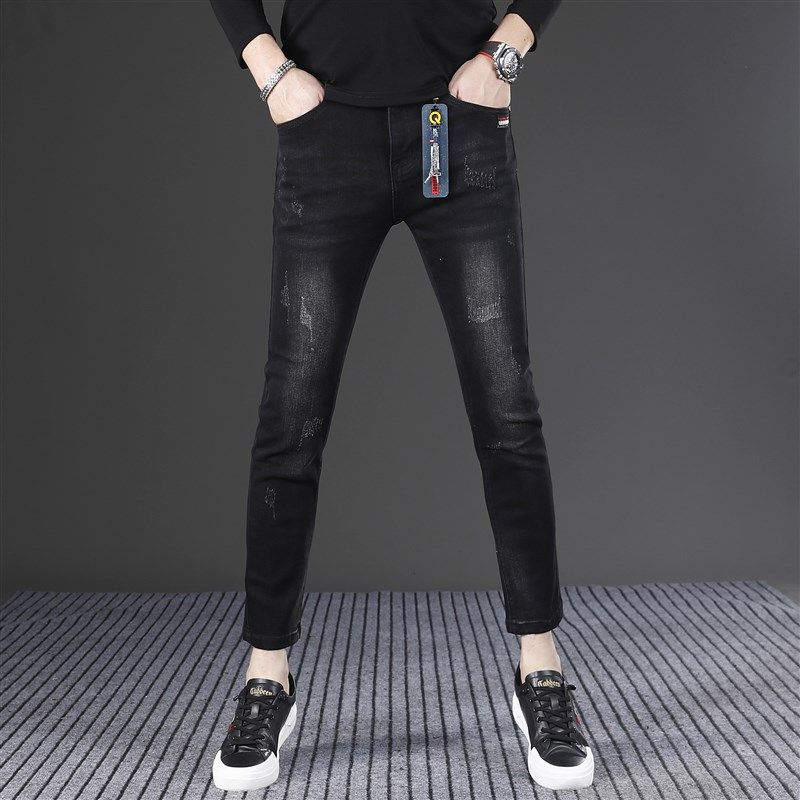 黑色加绒九分牛仔裤男款2024新款修身小脚韩版潮流男士裤子秋冬款