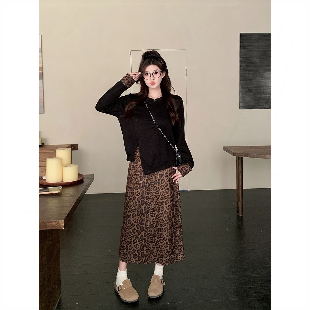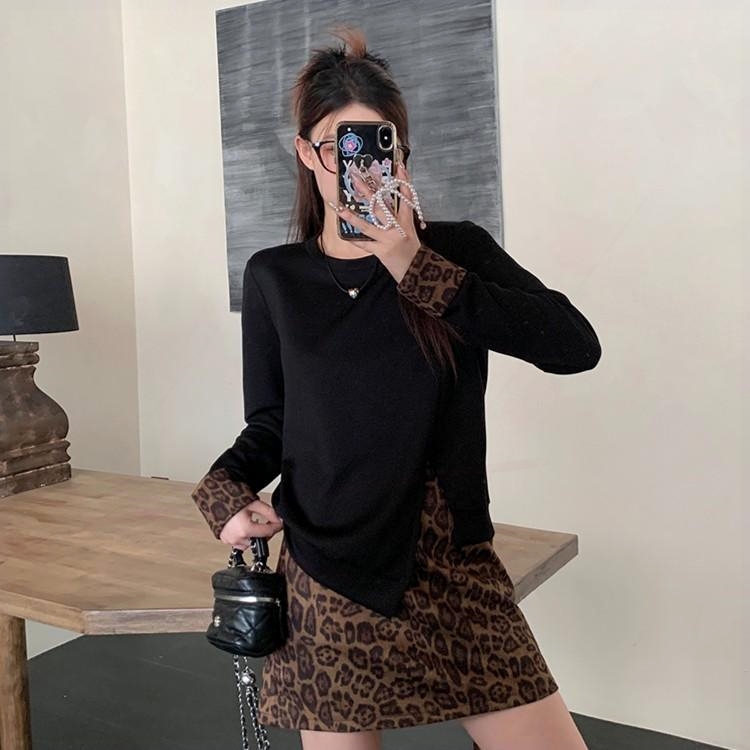 2025秋季大码女时尚不规则上衣豹纹长短裙套装 20718+2工作室原创
