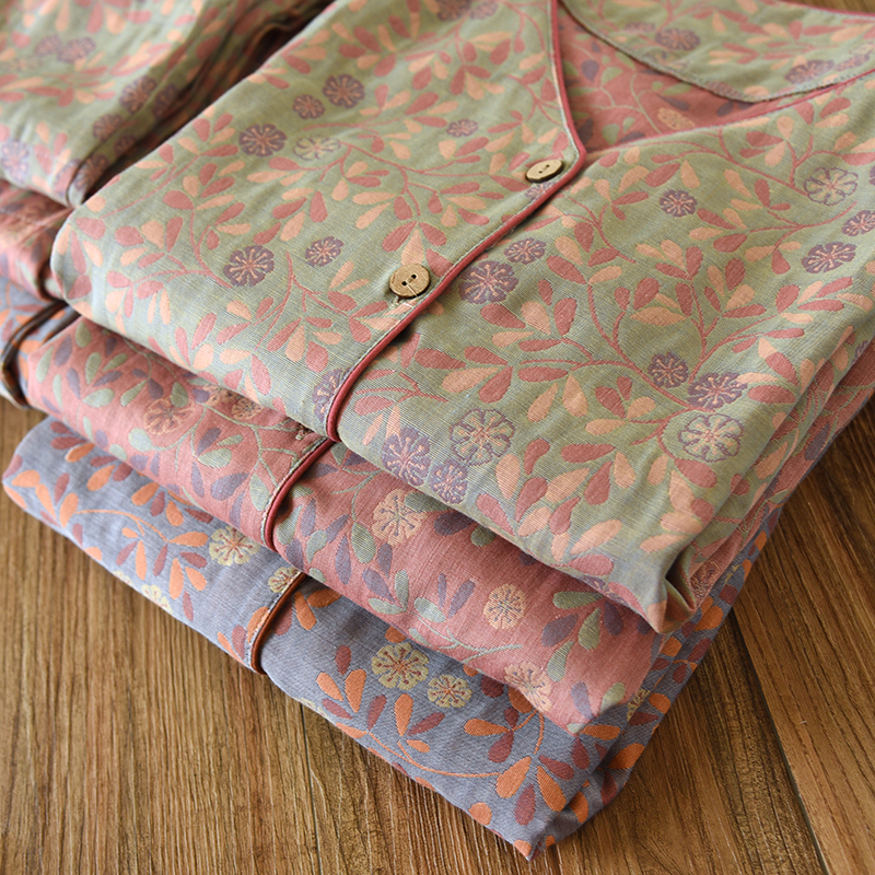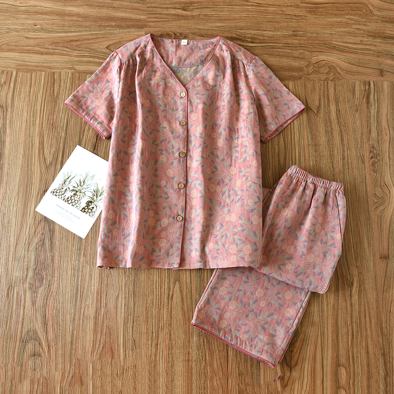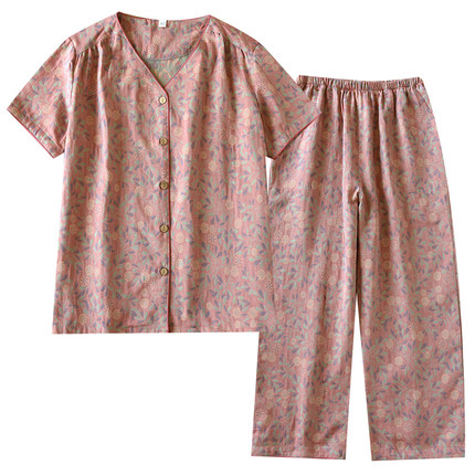 夏纯棉纱布睡衣女短袖七分裤V领色织绣花全棉薄款清凉家居服套装