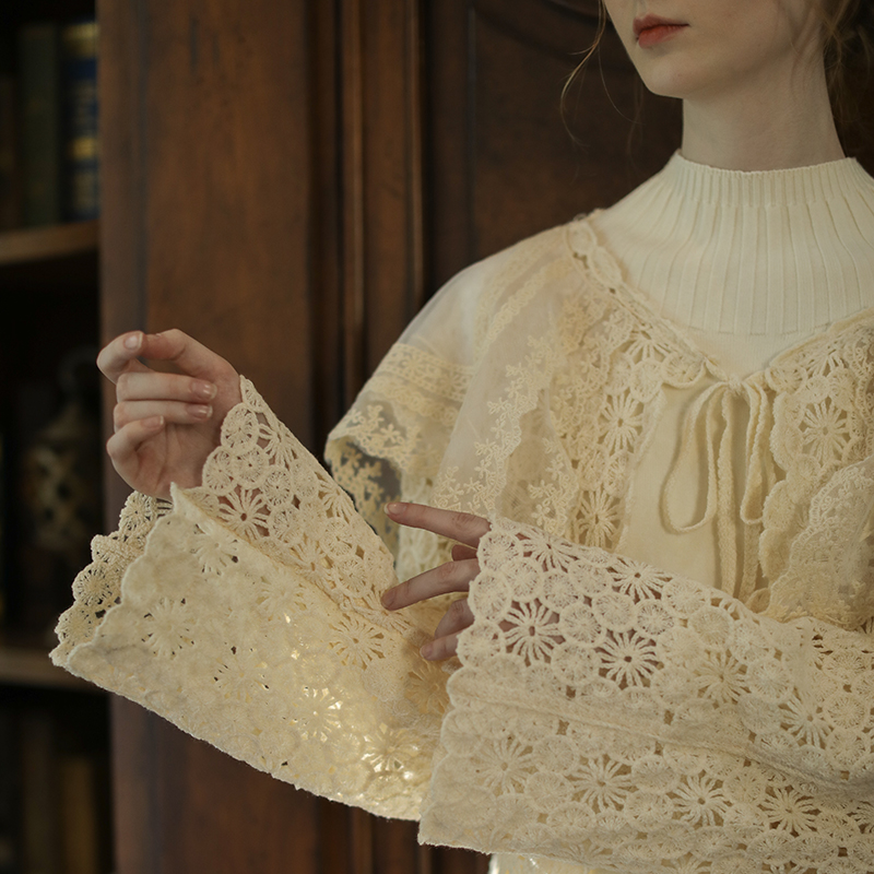 脸儿艺 森系 法式 钩花 双层蕾丝大翻领 百搭 宽松长款开衫 毛衣