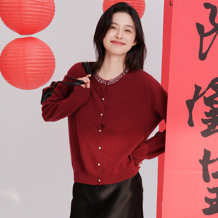 思诺芙德圆领镶钻100%山羊绒开衫女秋冬新款安哥拉红针织毛衣外套