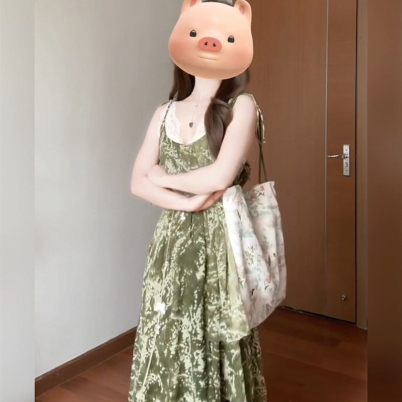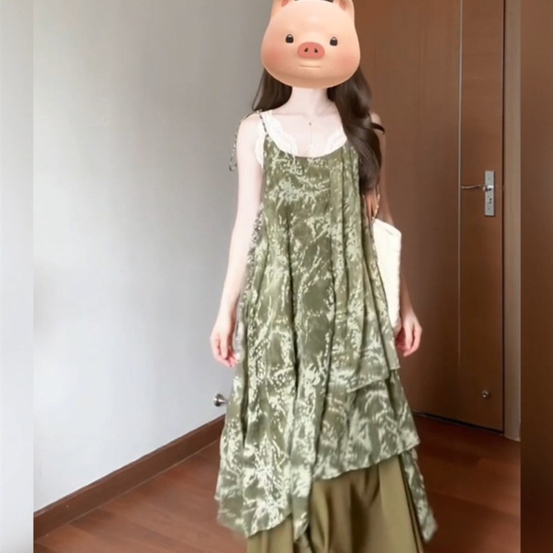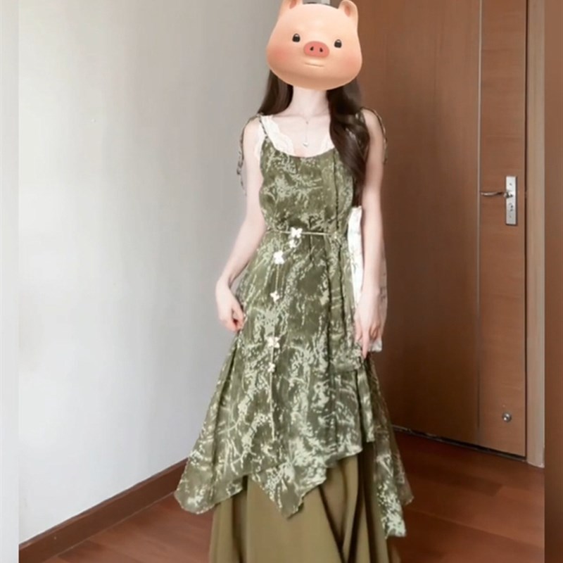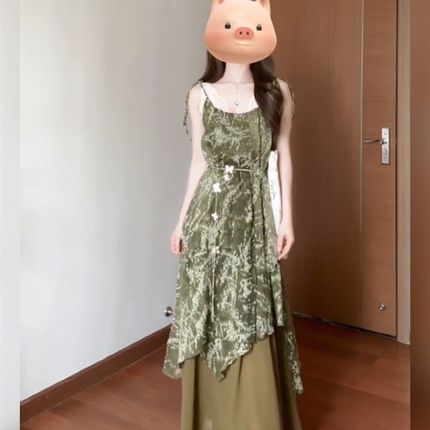 XZY/欣争艳 胖mm法式复古印染吊带连衣裙女夏高端精致不规则长裙