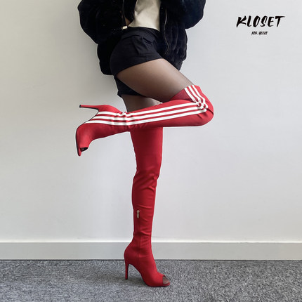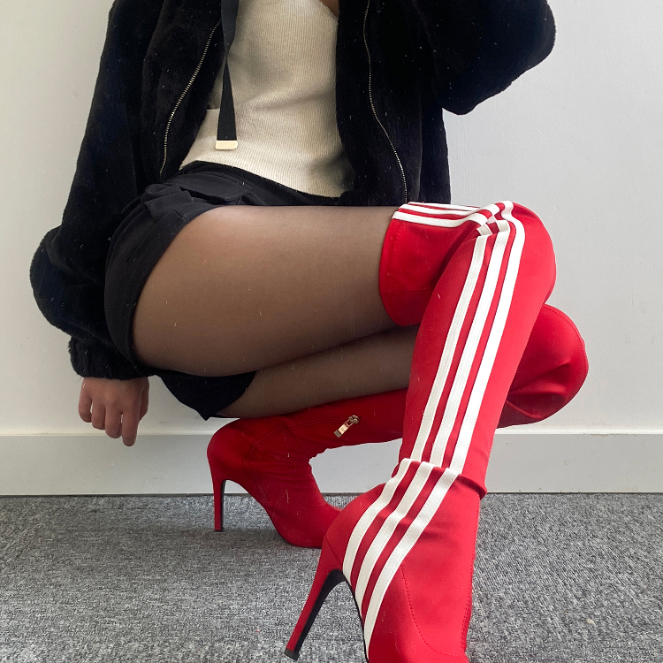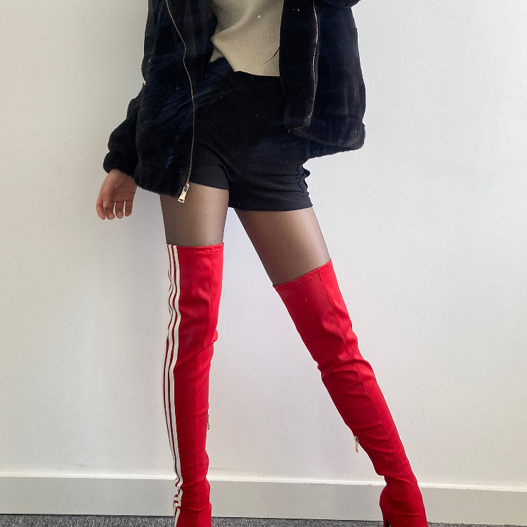 爵士舞高跟鞋heels舞鞋三条杠辣妹红色高跟靴长筒弹力长靴女