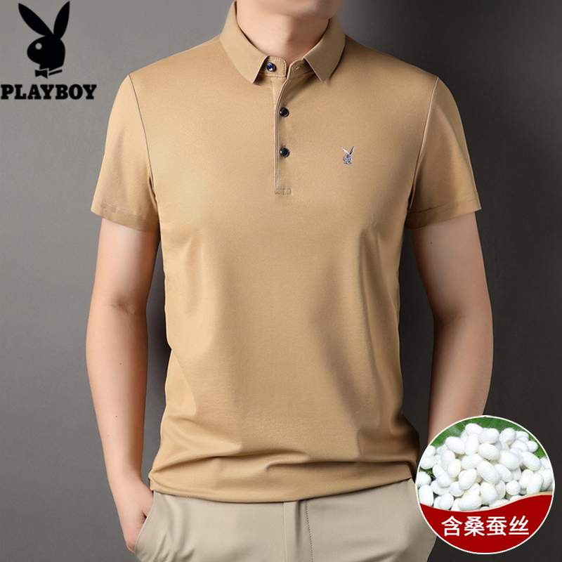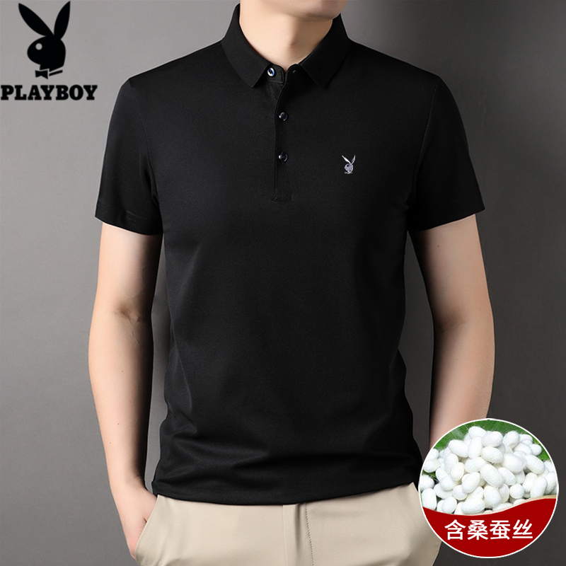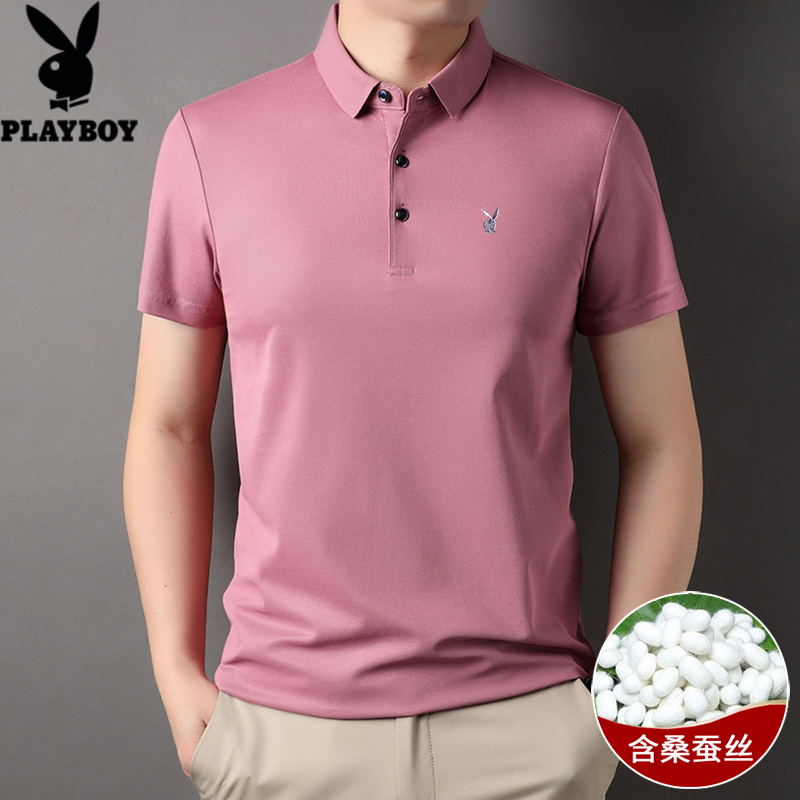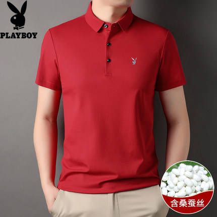花花公子桑蚕丝polo衫本命年红色男士短袖T恤中青年夏季薄款透气