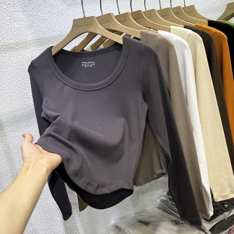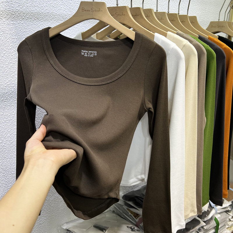 2025秋新款大圆领露锁骨螺纹棉长袖T恤女修身短款打底衫百搭上衣