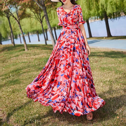 2025夏季新款名媛气质女神范印花真丝桑蚕丝连衣裙沙滩度假长裙子