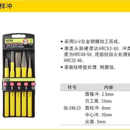 STANLEY/史丹利工具 5件套样冲定位冲 尖凿圆柱冲石工凿95-248-23