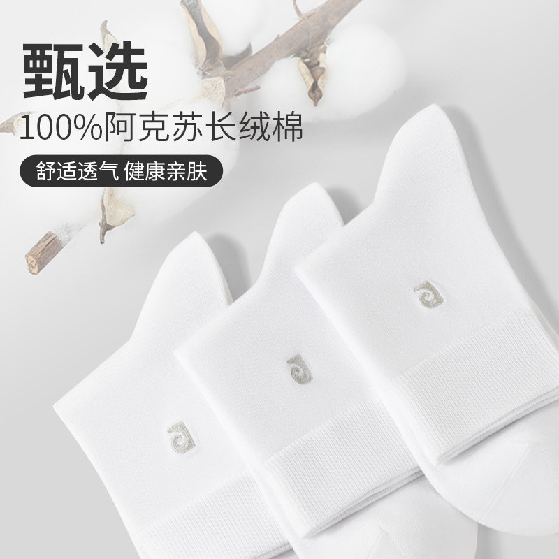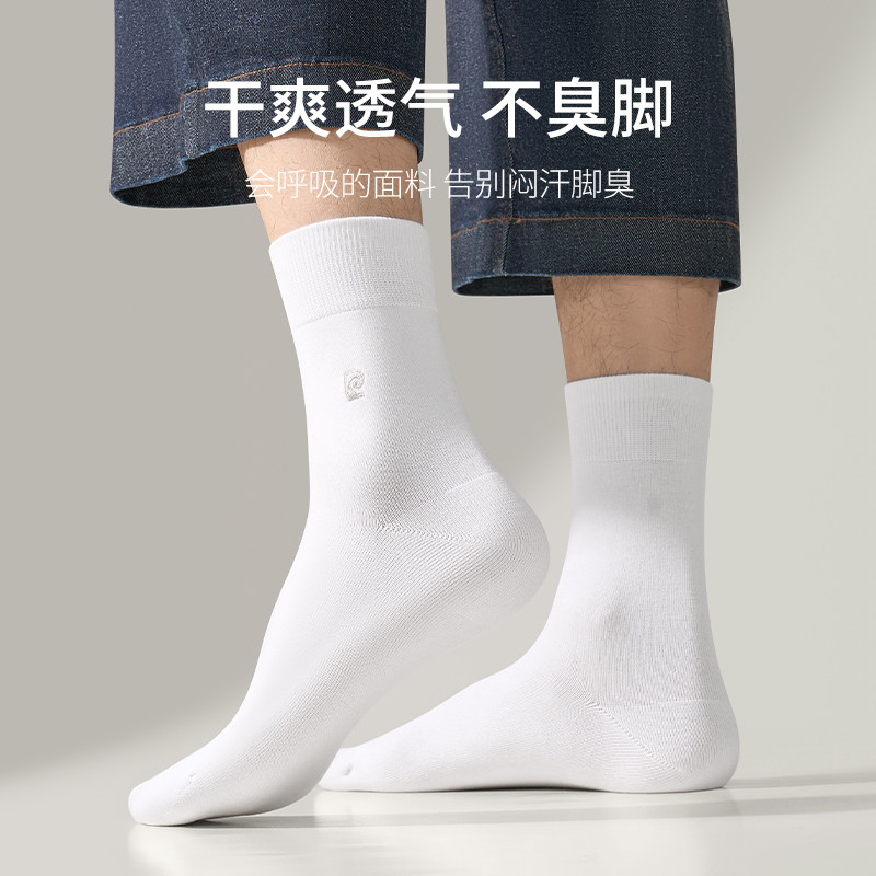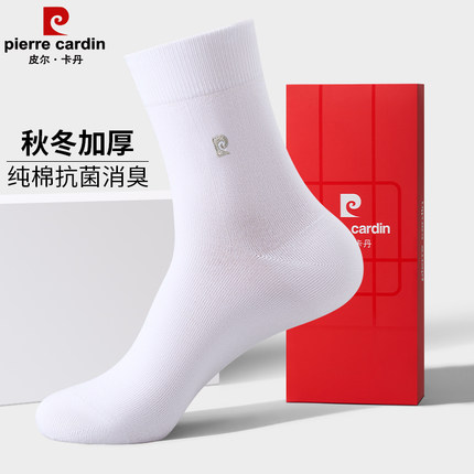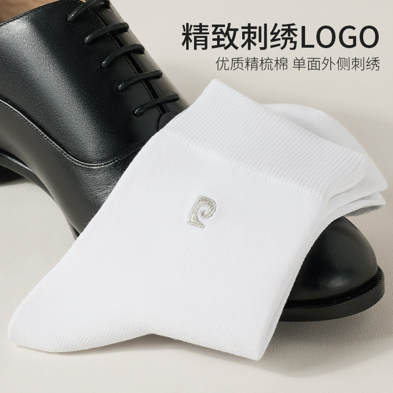 皮尔卡丹白色刺绣标秋冬季保暖纯棉加厚袜子男中筒袜夏天薄款男袜