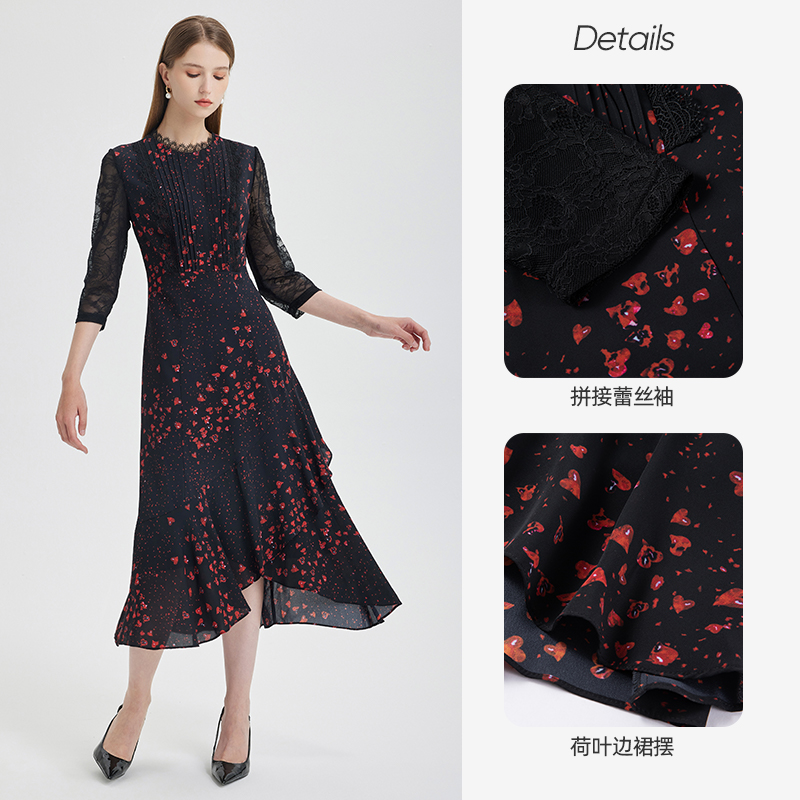 专柜正品马天奴女装早秋新款黑色印花连衣裙气质裙子蕾丝袖长裙