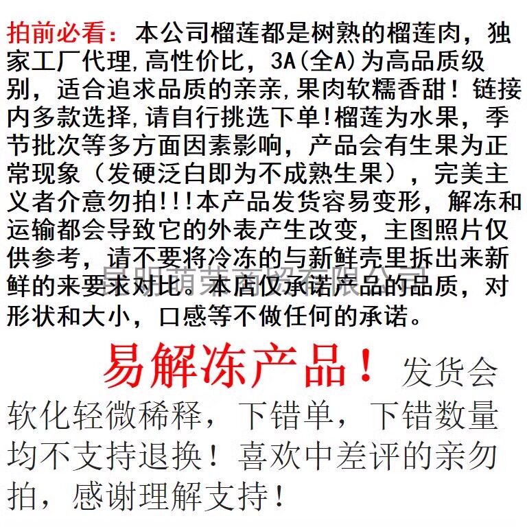 泰国金枕冷冻无核榴莲肉3kg高品质AAA级榴莲果肉披萨甜点原料包邮
