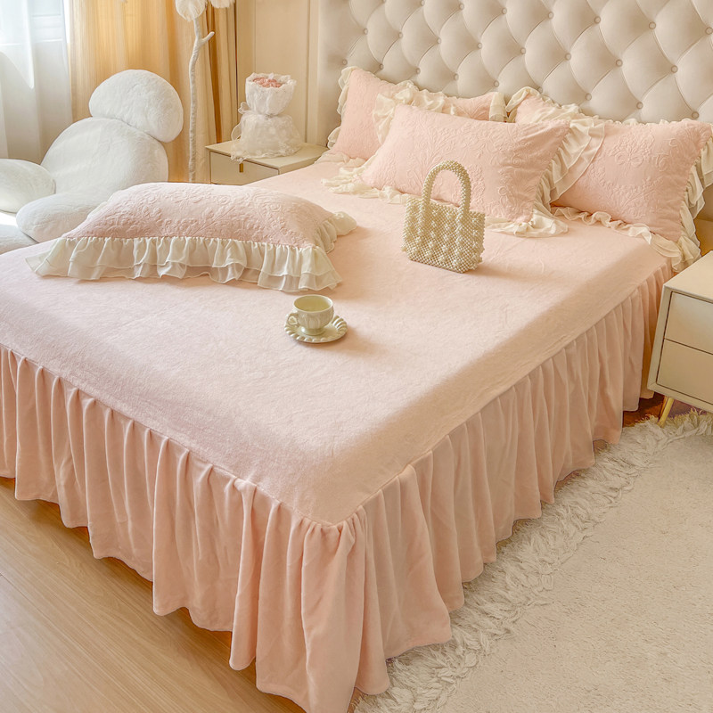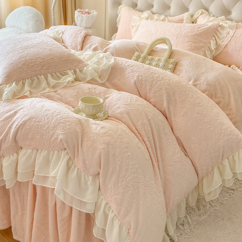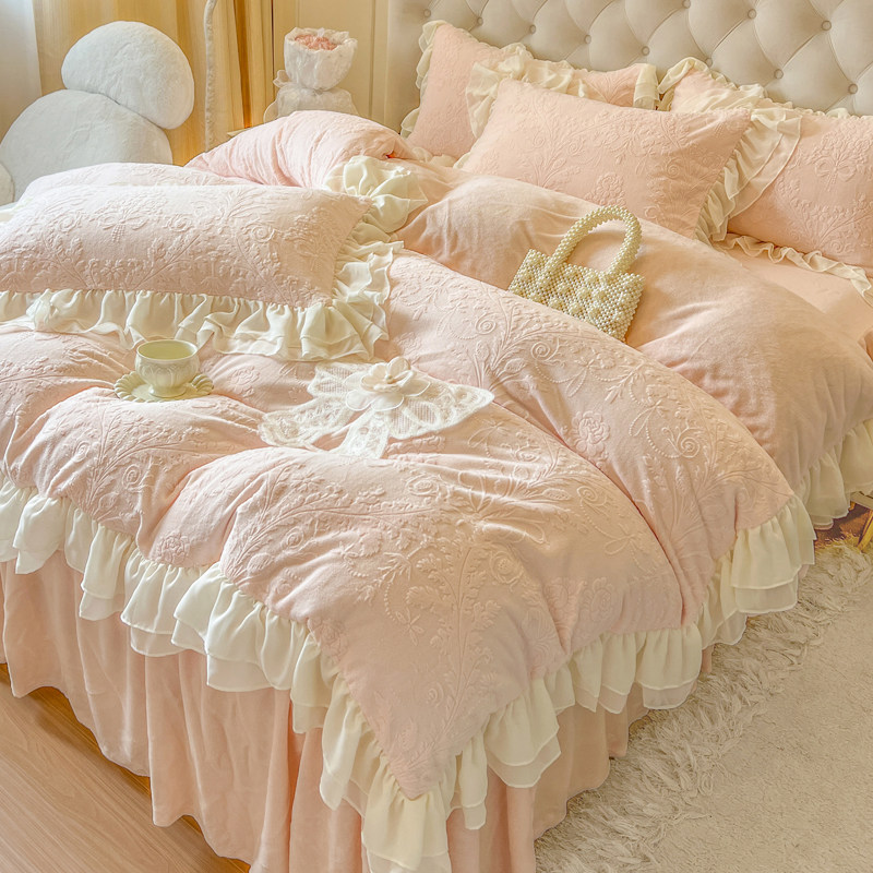法式冬季粉色少女加厚牛奶绒四件套公主风蕾丝毛绒被套珊瑚绒床裙