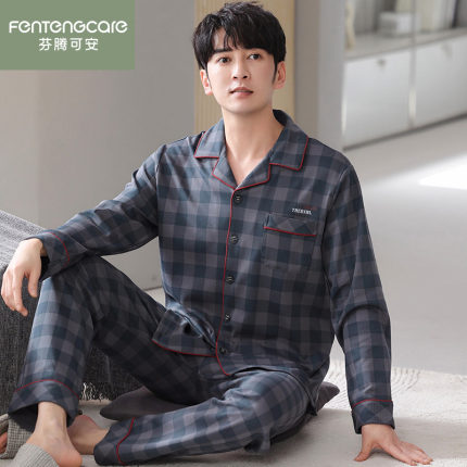 芬腾可安睡衣男士春秋长袖纯棉爸爸家居服薄款可外穿全棉大码套装