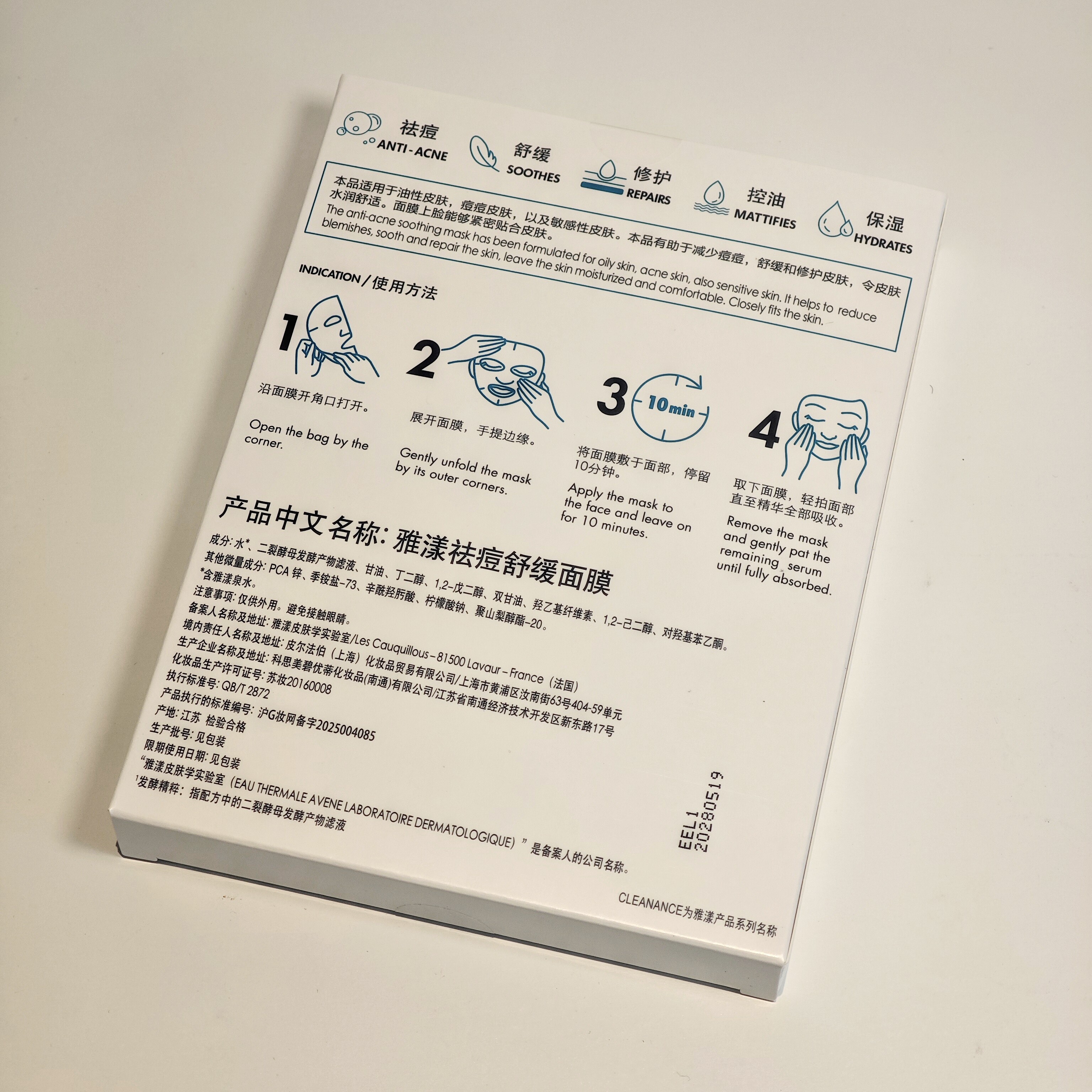 国柜正品雅漾改善痘痘舒缓面膜5片小黑膜保湿修护敏感肌二裂酵母