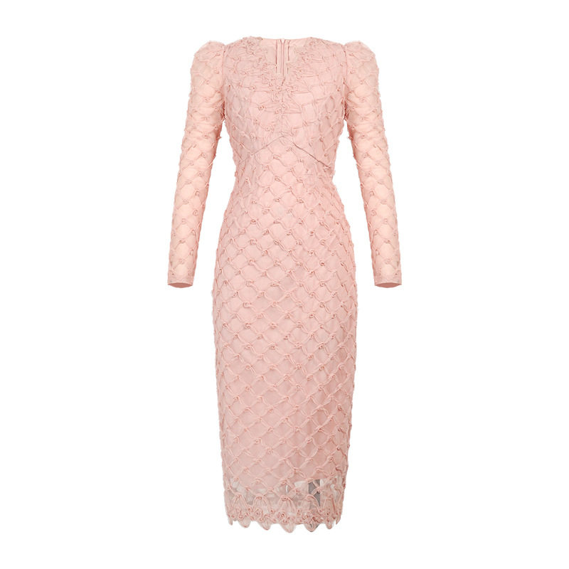 粉色泡泡袖立体纹收腰中长裙秋冬新款名媛宴会礼服连衣裙女11691