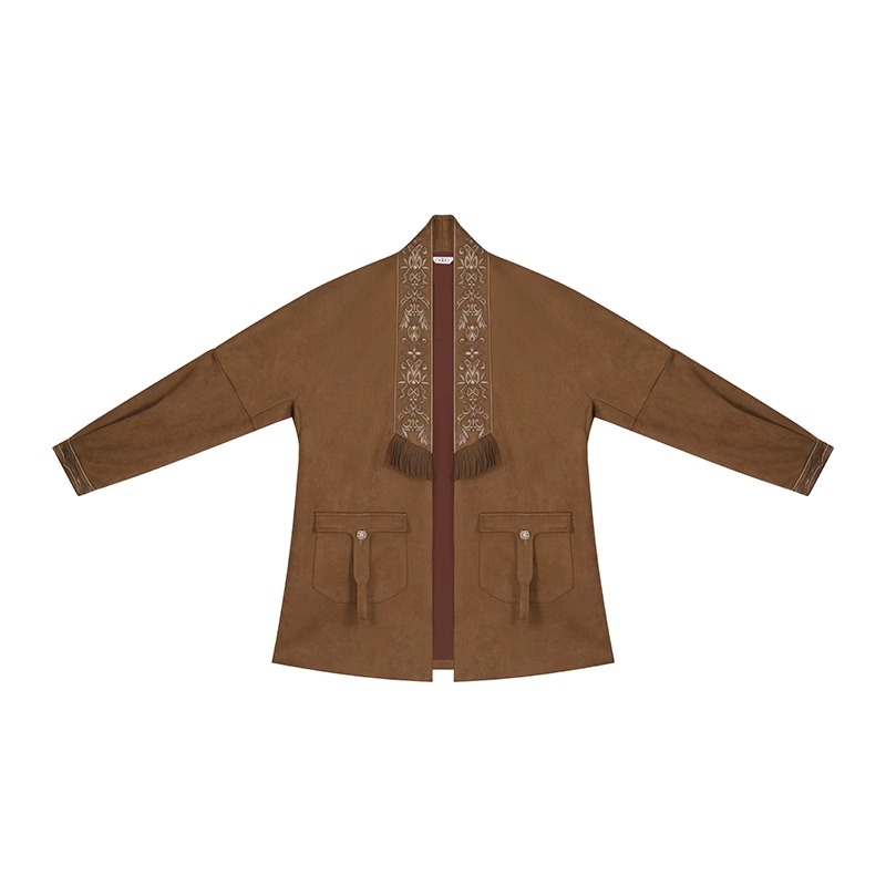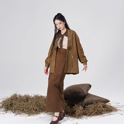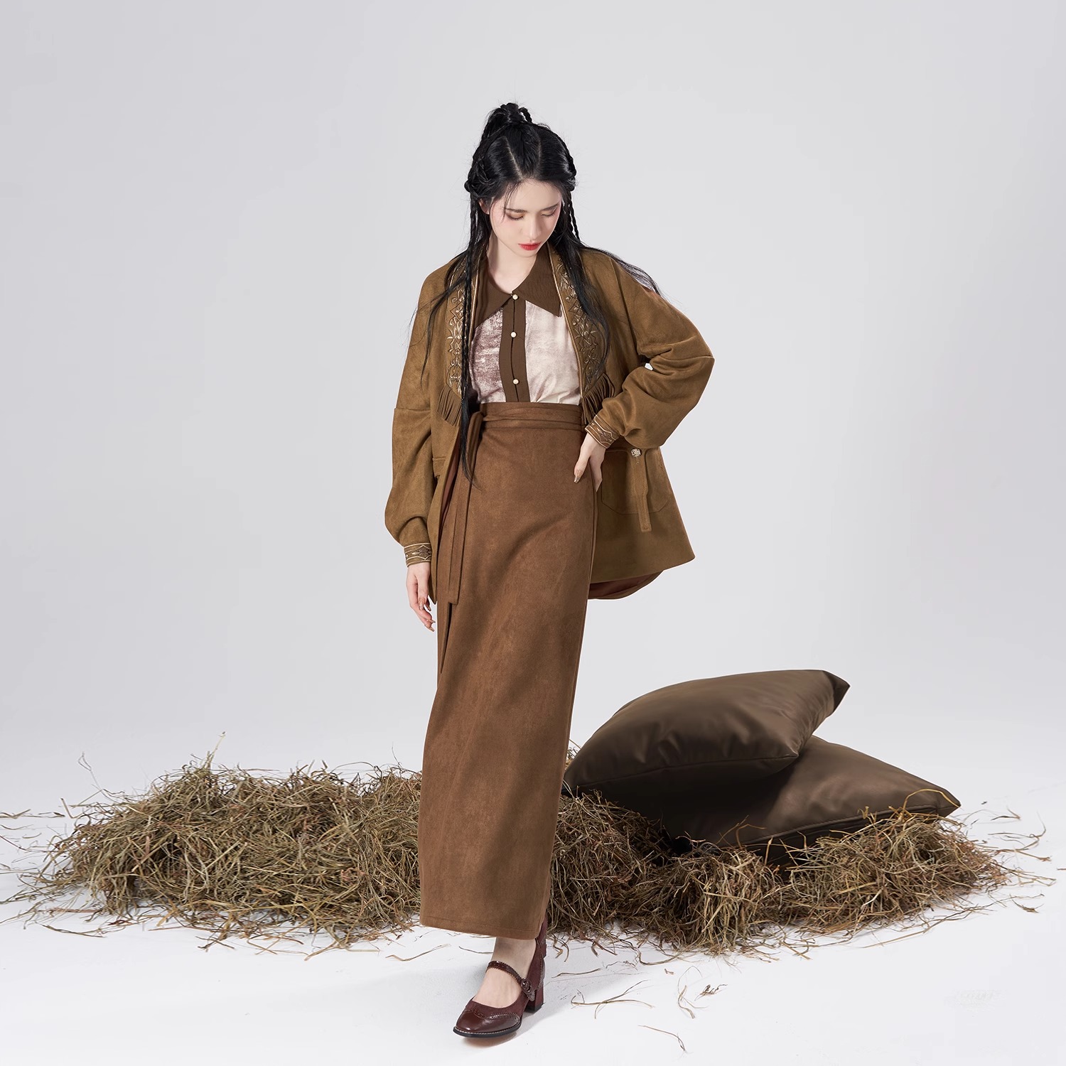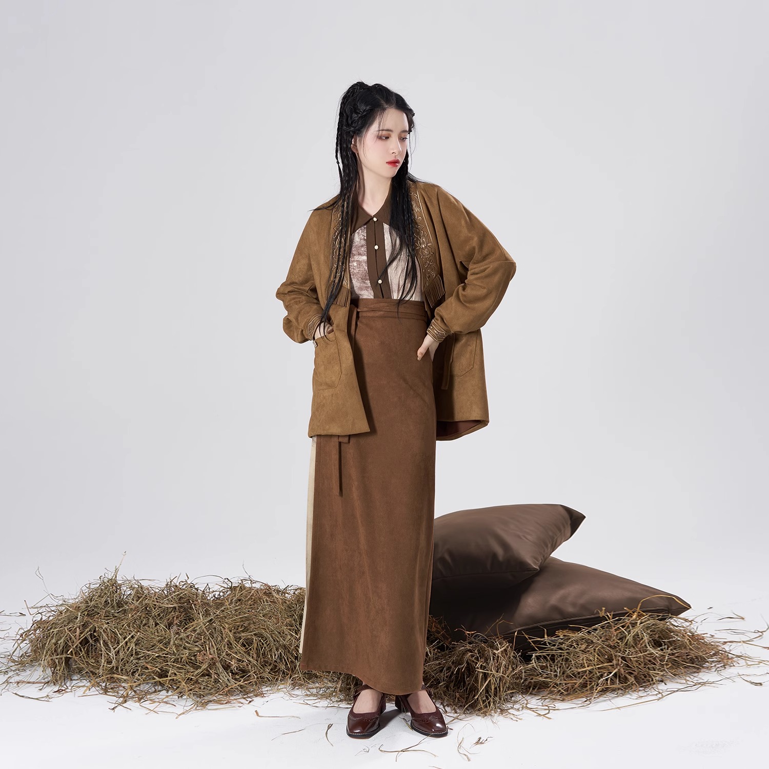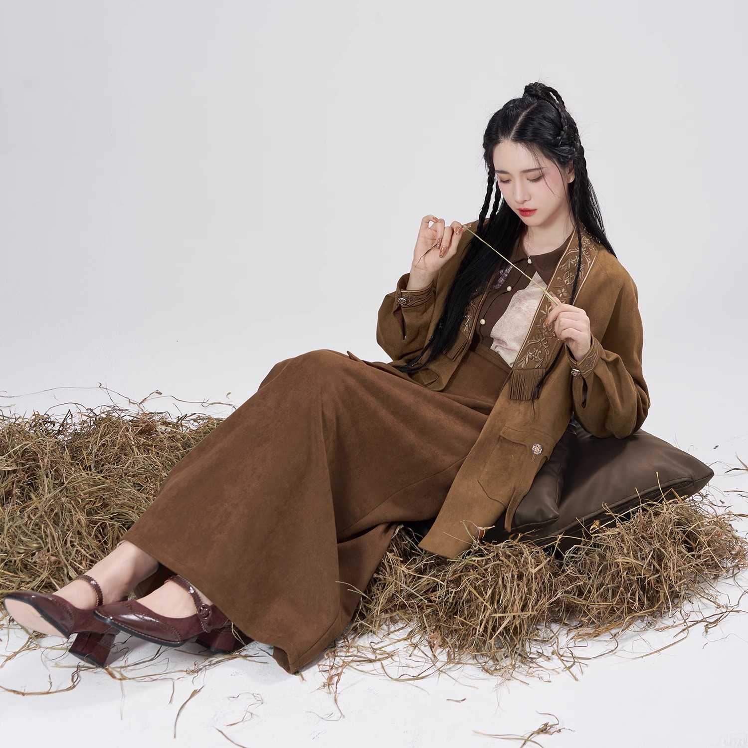 都市游牧织造司原创宋制汉服麂皮绒绣花外套水墨印花衬衫改良旋裙